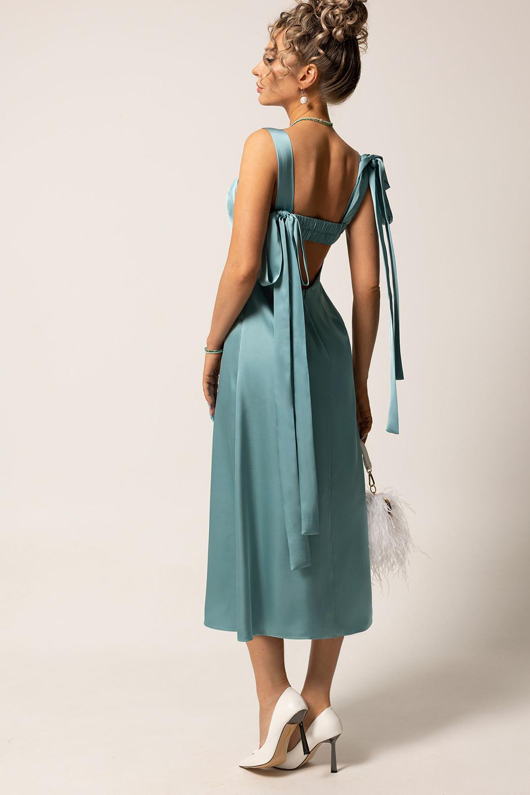 Платье без воротника, на бретелях- завязках , застежкой на потайную молнию в среднем шве спинки. По переду с нагрудными вытачками. По спинке- со средним швом, талиевыми вытачками. Вырез спинки-V-образный. Планка спинки присборена на резинку. Платье без подкладки.