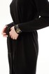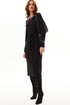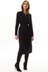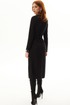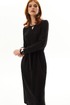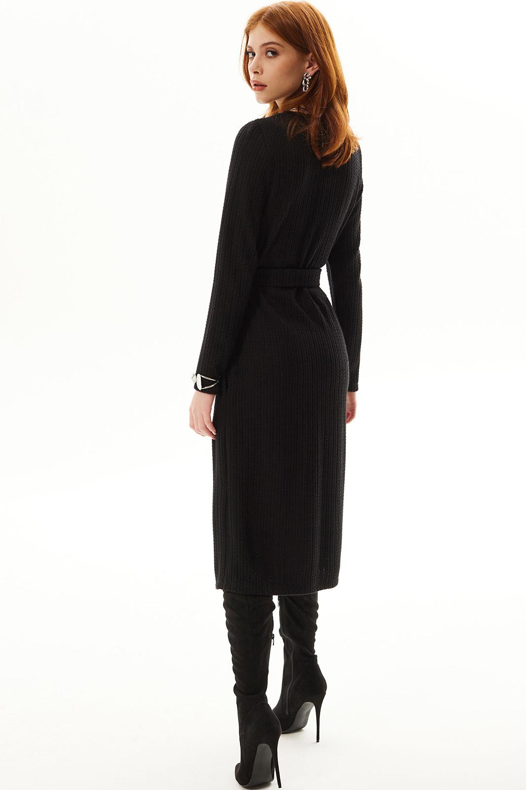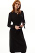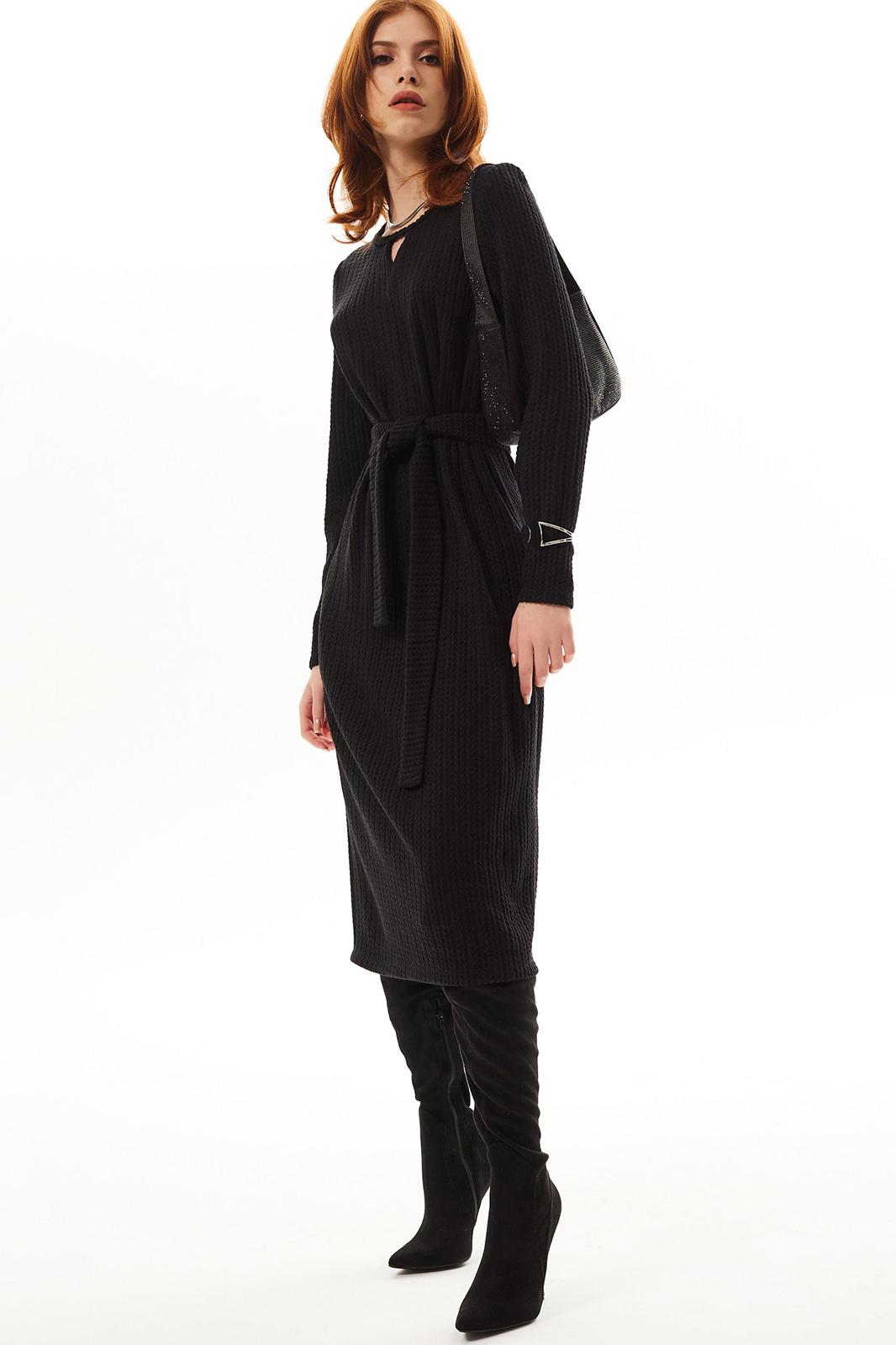 Платье прямого силуэта, без воротника, с круглым вырезом горловины, без застежки. По горловине переда фигурный вырез, срез горловины обработан бейкой. Перед с талиевыми вытачками, в боковых швах расположены карманы. Рукав втачной, длинный.