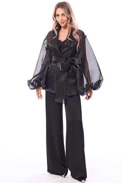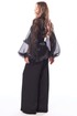 Туника без застежки, с отрезной планкой горловины. Плечо спущенное. Рукав длинный, с отрезной манжетой. По шву притачивания манжеты рукав присборен. Туника со съемным поясом.