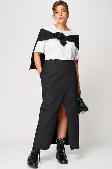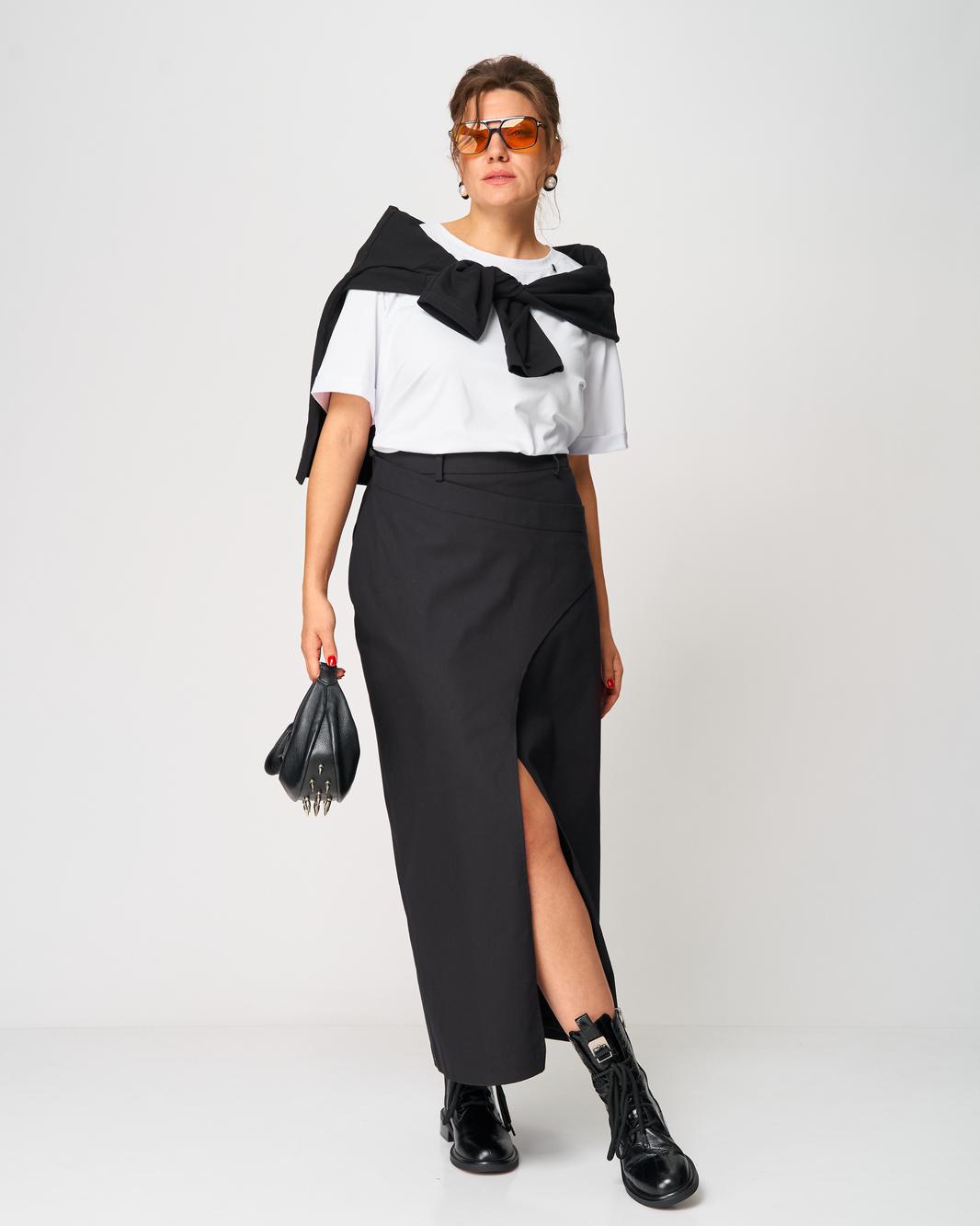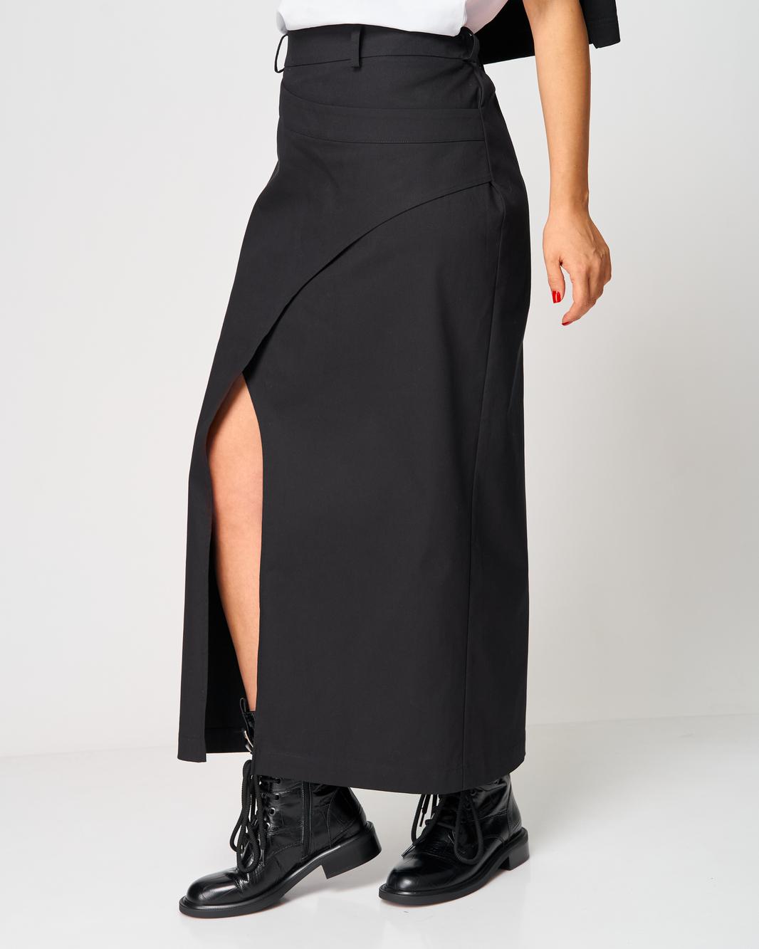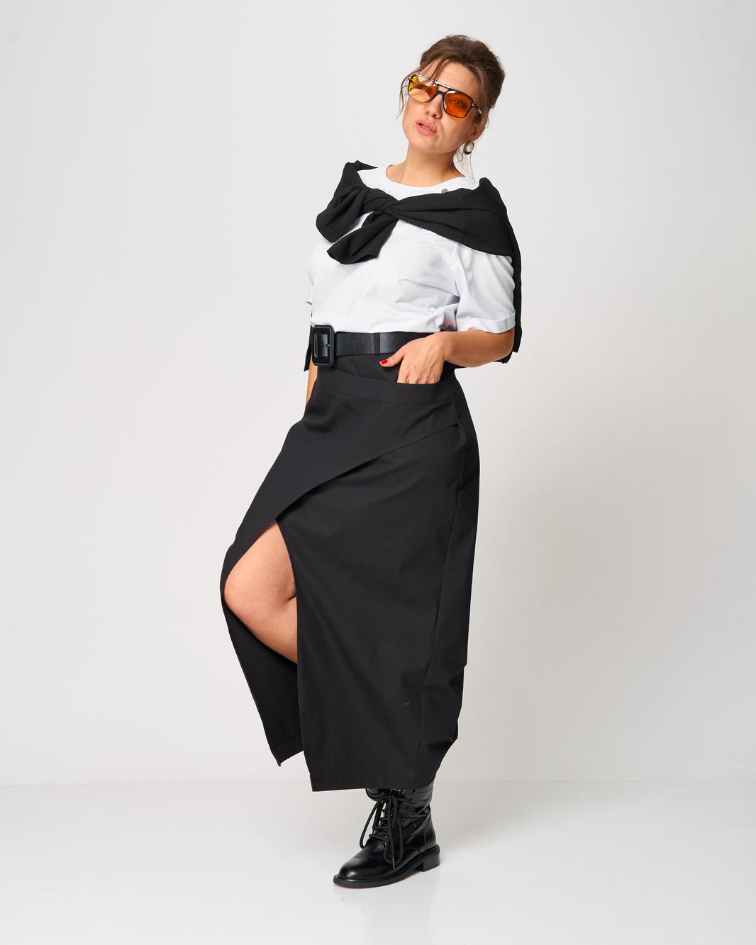 Особое внимание привлекает асимметричный линийный крой и выразительный длинный разрез спереди, который добавляет образу женственность, смелость и лёгкую нотку драматичности. Юбка выглядит одновременно современно, минималистично и очень утончённо, подходит как для будней, так и для особых выходов.