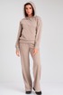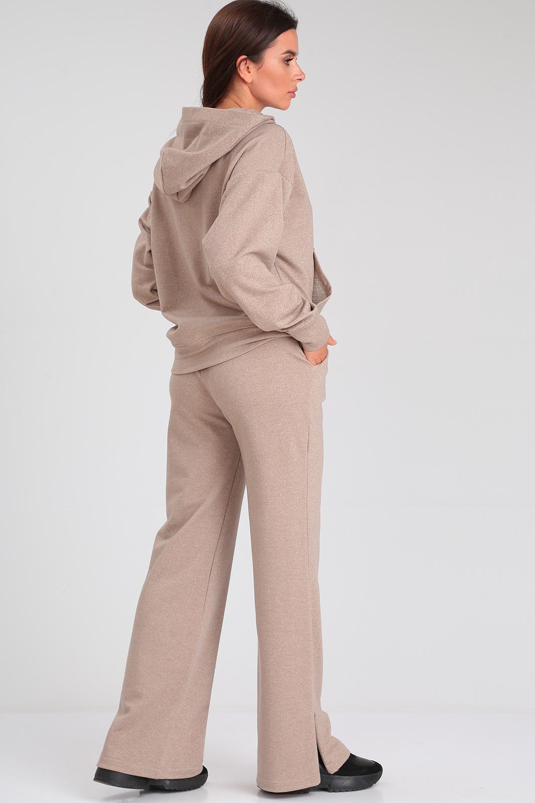 Женский костюм выполнен из хлопкового футера 3-ех нитка с добавлением люрексовой нити. Стильное объёмное худи с капюшоном, удлиненное сзади, имеет приспущенный рукав, также по переду настрочной карман-кенгуру. Манжеты из основной ткани. Брюки клешеные высокой посадки с боковыми карманами, пояс на резинке, по низу брючины сбоку вставлена потайная молния для того, чтобы регулировать высоту разреза по желанию. Оба изделия отличаются своей функциональностью и их можно с легкостью комбинировать с различными вещами и обувью Вашего гардероба. Длина худи по спинке 62 см, длина рукава от горловины 70 см. Длина брюк по боковому шву 108 (+-1 см), по шаговому 81. Рост модели на фото 170 см, размер 44 (S).