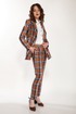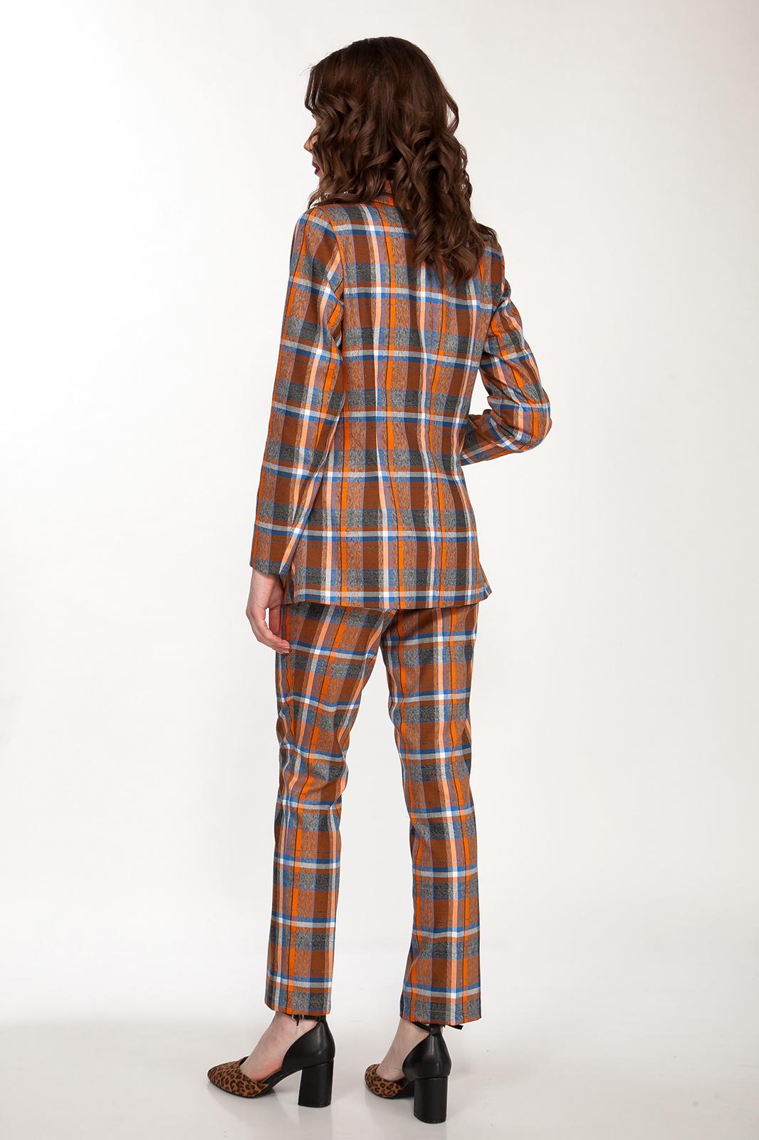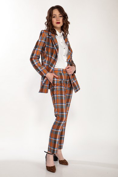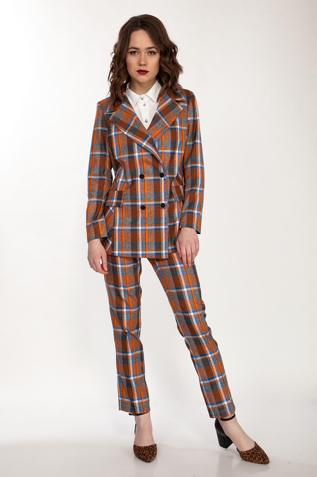 Комплект женский трехпредметный состоит из жакета, брюк и блузки. Жакет полуприлегающего силуэта выполнен из плотной костюмной ткани в клетку с добавлением эластана на подкладке. Жакет двубортный с отложным фигурным воротником и лацканом на две петли и пуговицы, вход в карман оформлен клапаном. Рукав втачной двухшовный длинный. Брюки прилегающего силуэта, в боковых швах карманы, на притачном поясе с застежкой молнией и пуговицей. Блузка выполнена из блузочной ткани прямого силуэта, воротник отрезной на стойке с декором по отлету воротника, застежка по переду на петли и пуговицы, рукав втачной длинный на манжете, понизу в боковых швах разрезы. Длина блузки 65 см, длина рукава с манжетом 64 см. Длина жакета 68 см, длина рукава 61 см. Длина брюк 103 см.