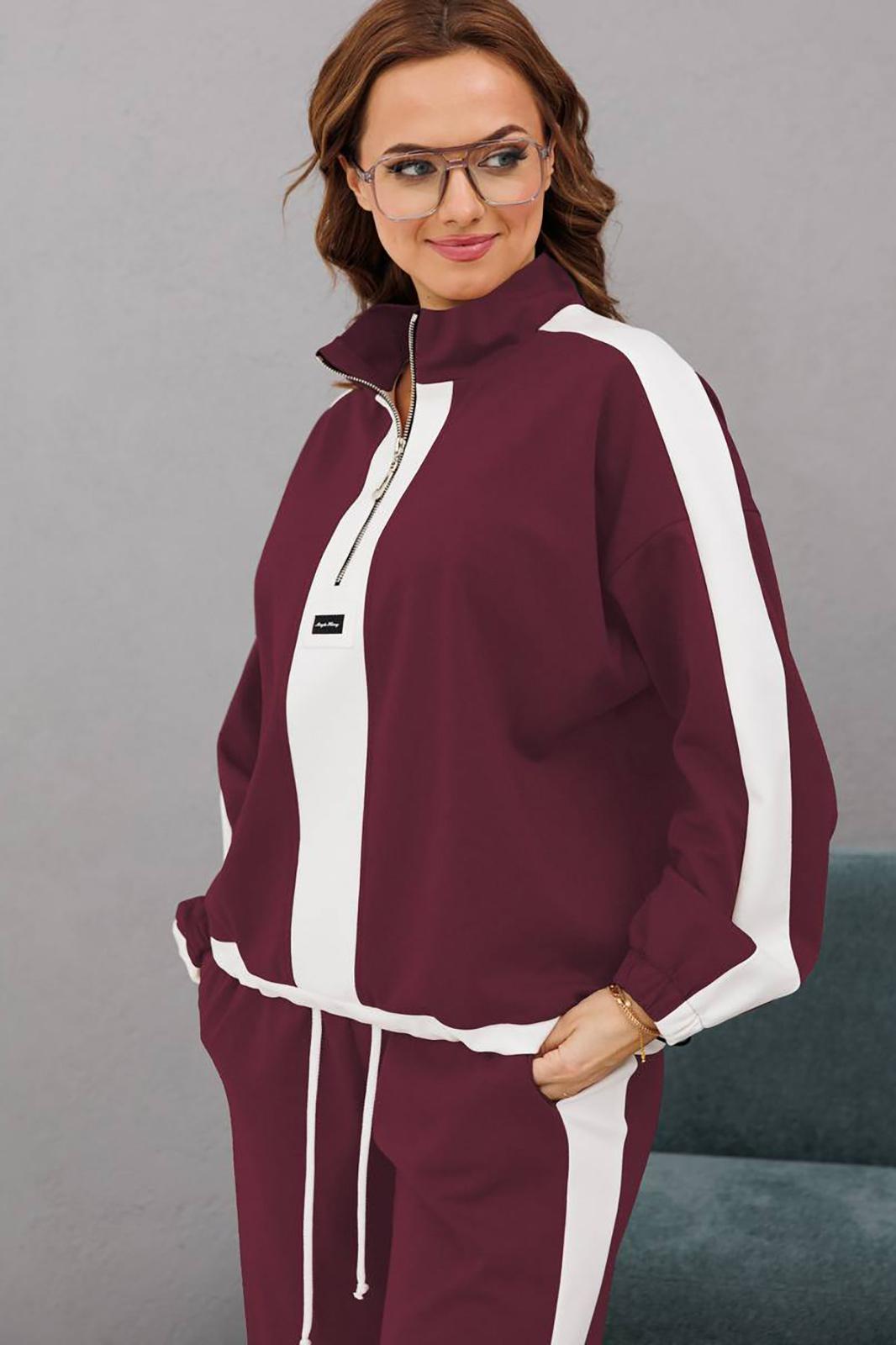 Джемпер свободного силуэта, вырез горловины со стойкой и застежкой на тесьму-молнию. Рукав спущенный, длинный. Декором являются лампасы из отделочной ткани. По лицу изделия кулиса из резинки.