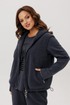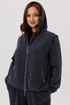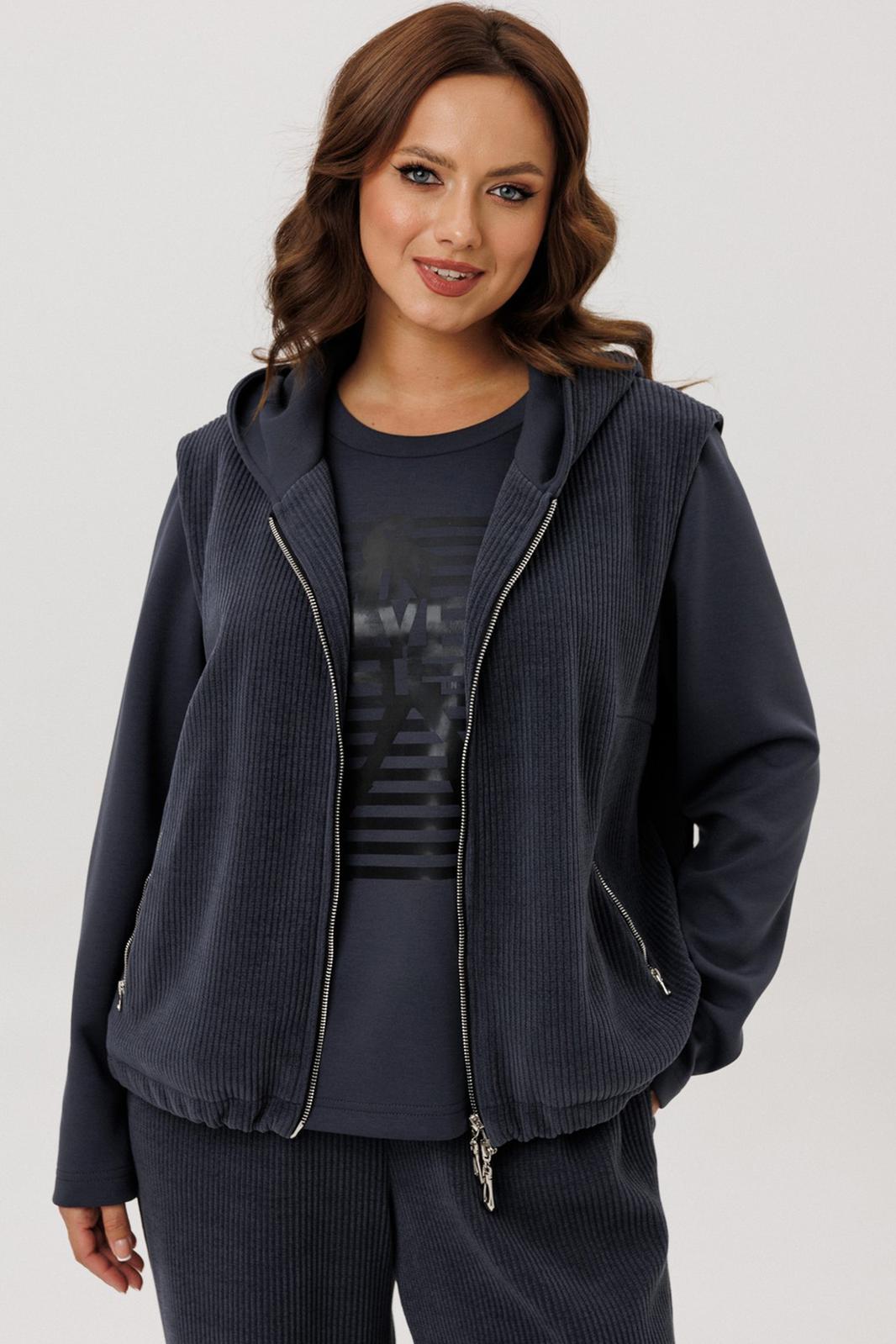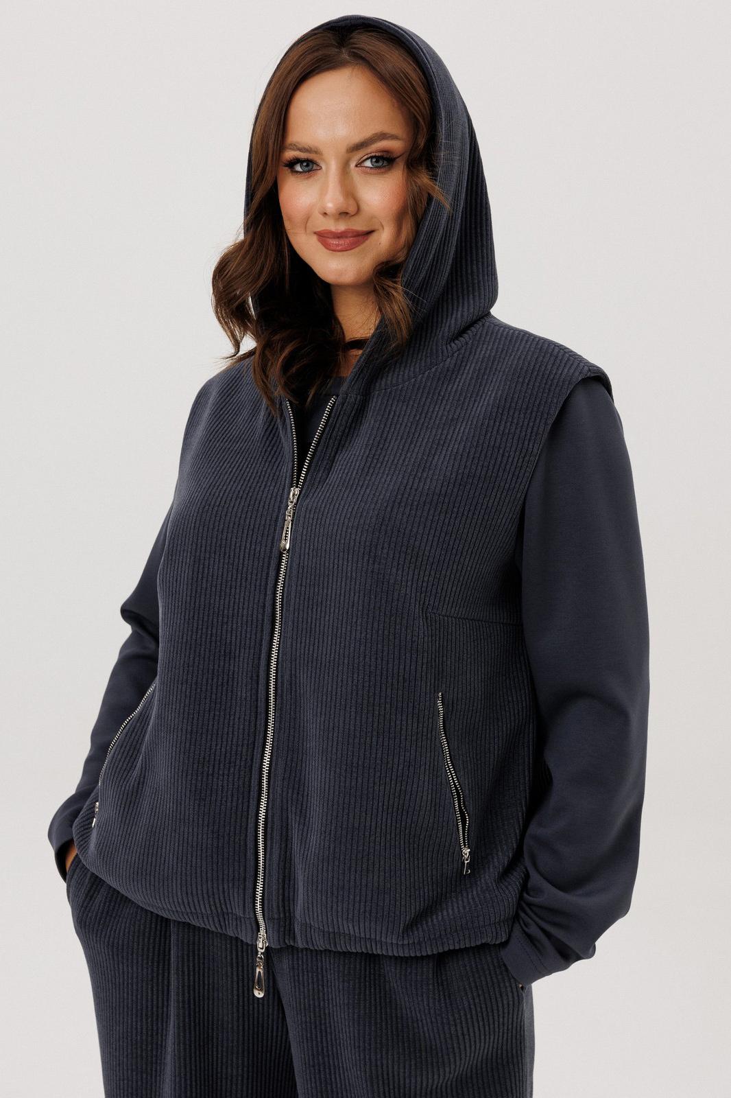 Жилет свободного силуэта с капюшоном, без рукавов. По переду карманы на молнии, по низу на кулисе-резинке.. Застежка на тесьму-молнию по переду.