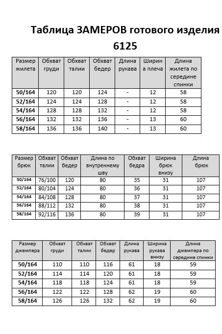 - Тип ткани: Жилет и брюки: 98% полиэстер, 2% спандекс. Джемпер: 81% полиэстер, 14% вискоза, 5% спандекс.