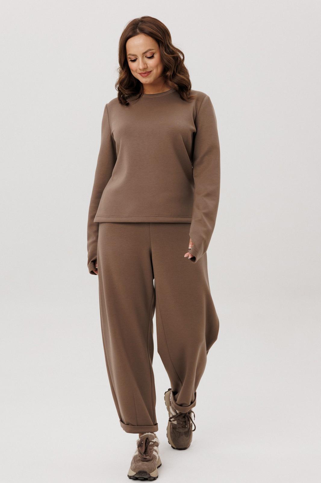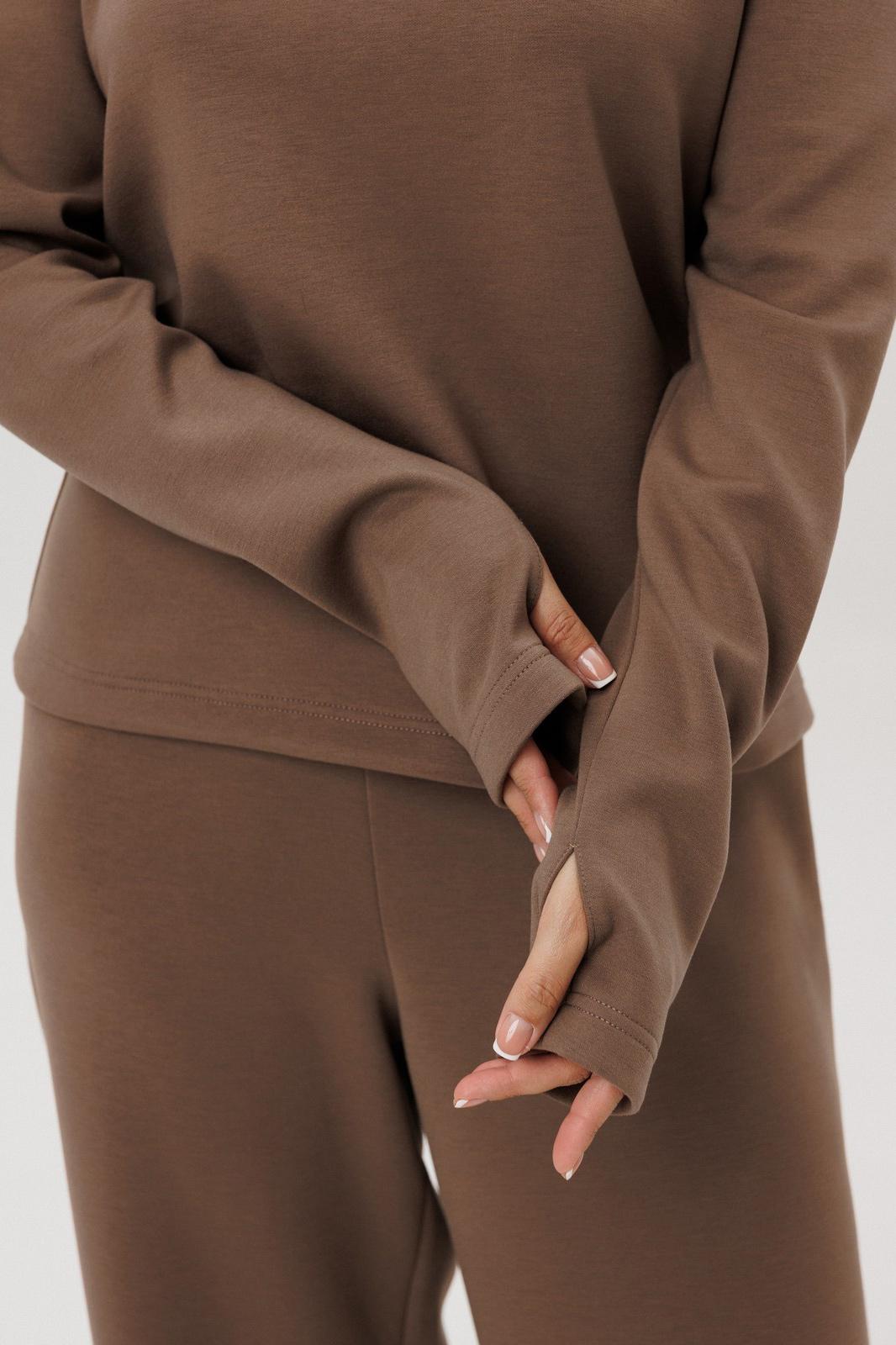 Джемпер свободного силуэта, вырез горловины округлый, рукав втачной, по низу с вырезом для пальца на прохладную погоду. Изделие без застежки.