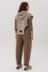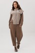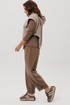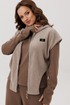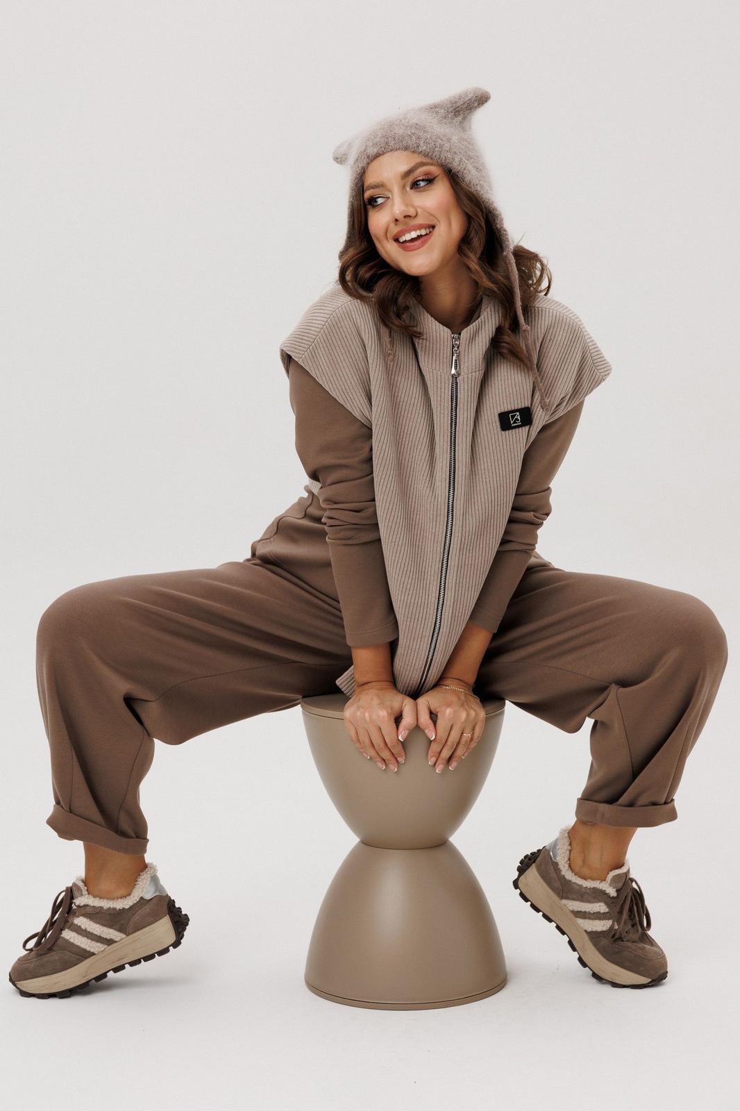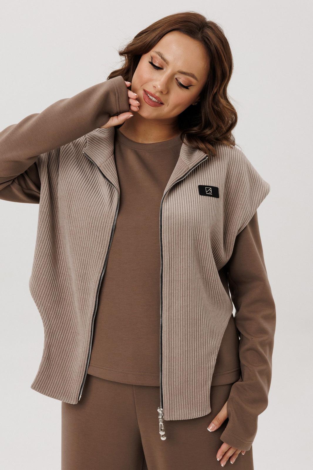 Жилет свободного силуэта с ассиметричным кроем по низу. Изделие без рукавов, с капюшоном. Застежка на тесьму-молнию по переду.