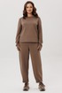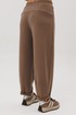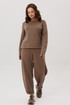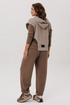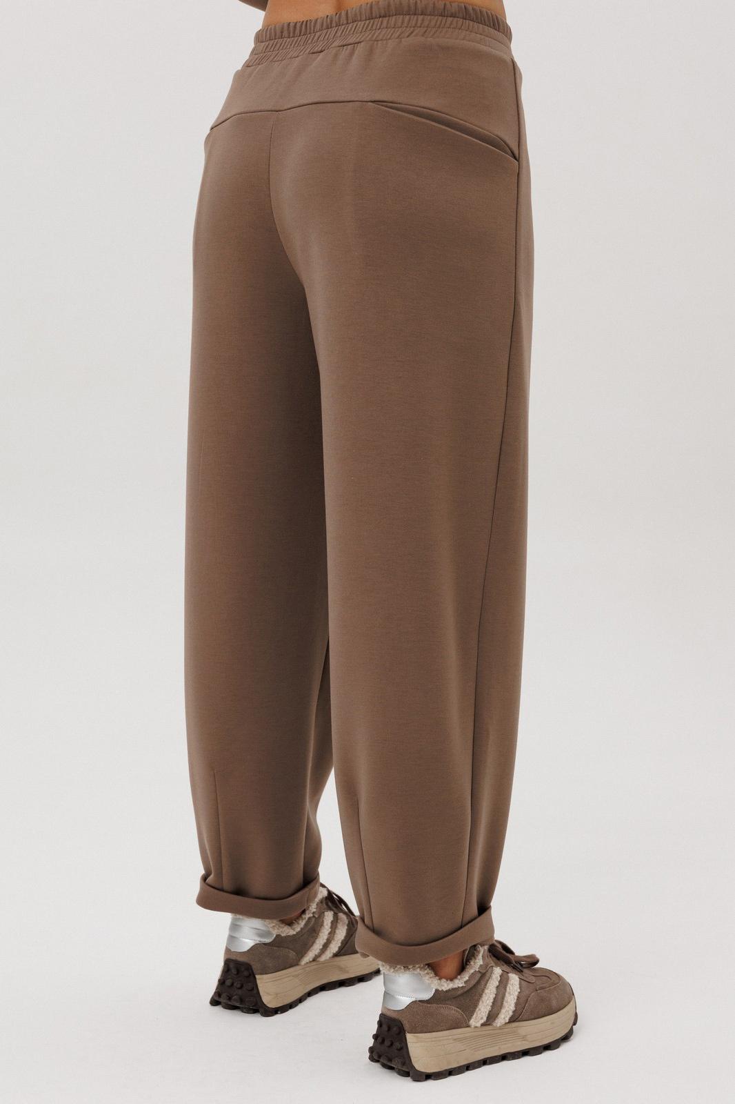 Брюки «бананы». По талии на резинке, без застежки. В боковых швах и на заднем полотнище имеются карманы. По низу брюк манжет и выточка.