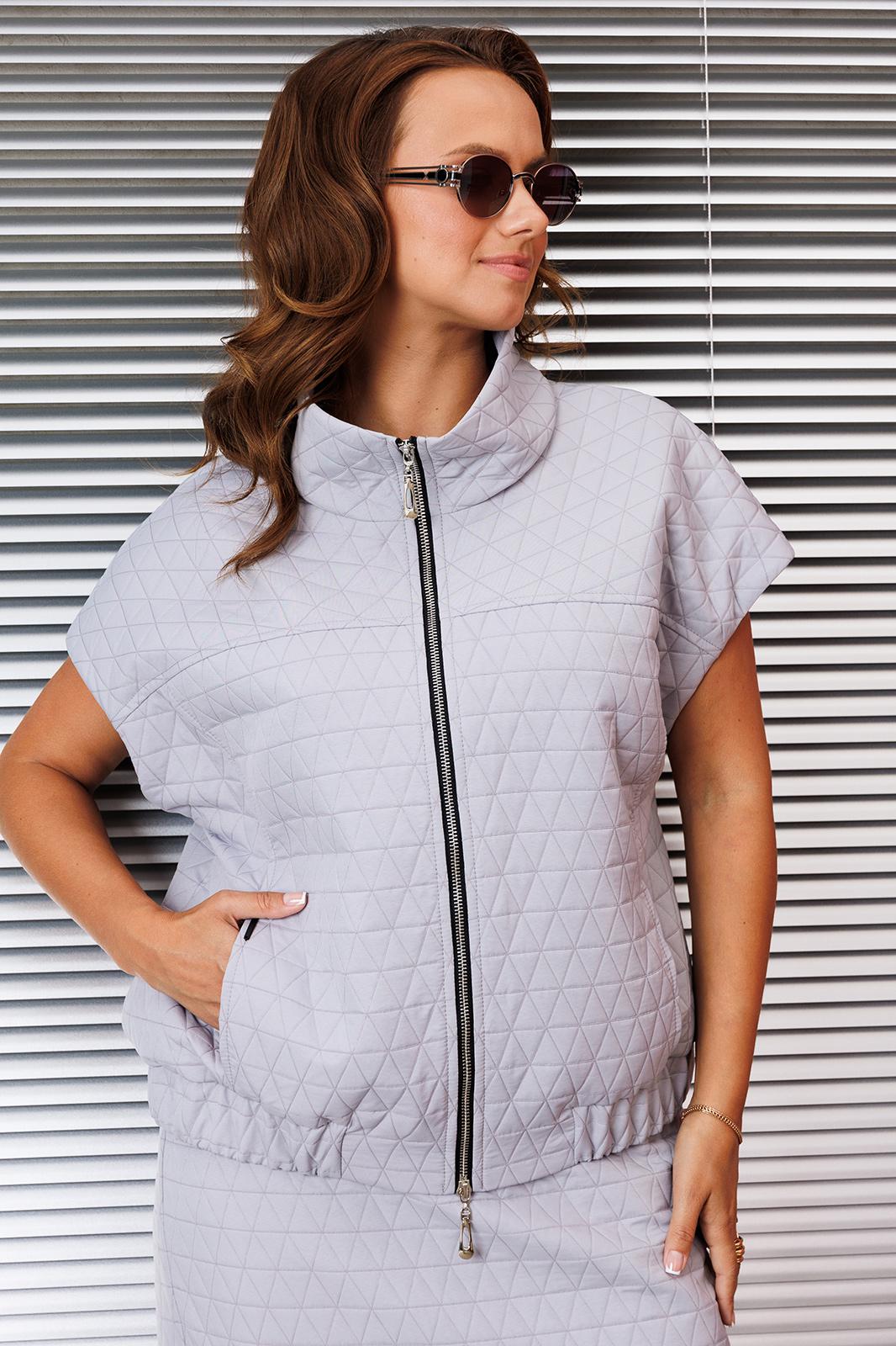 Жилет свободного силуэта, вырез горловины со стойкой, без рукава, по переду карманы в шве рельефа. По низу изделие на резинке, застежка на тесьму-молнию. Жилет на подкладке.