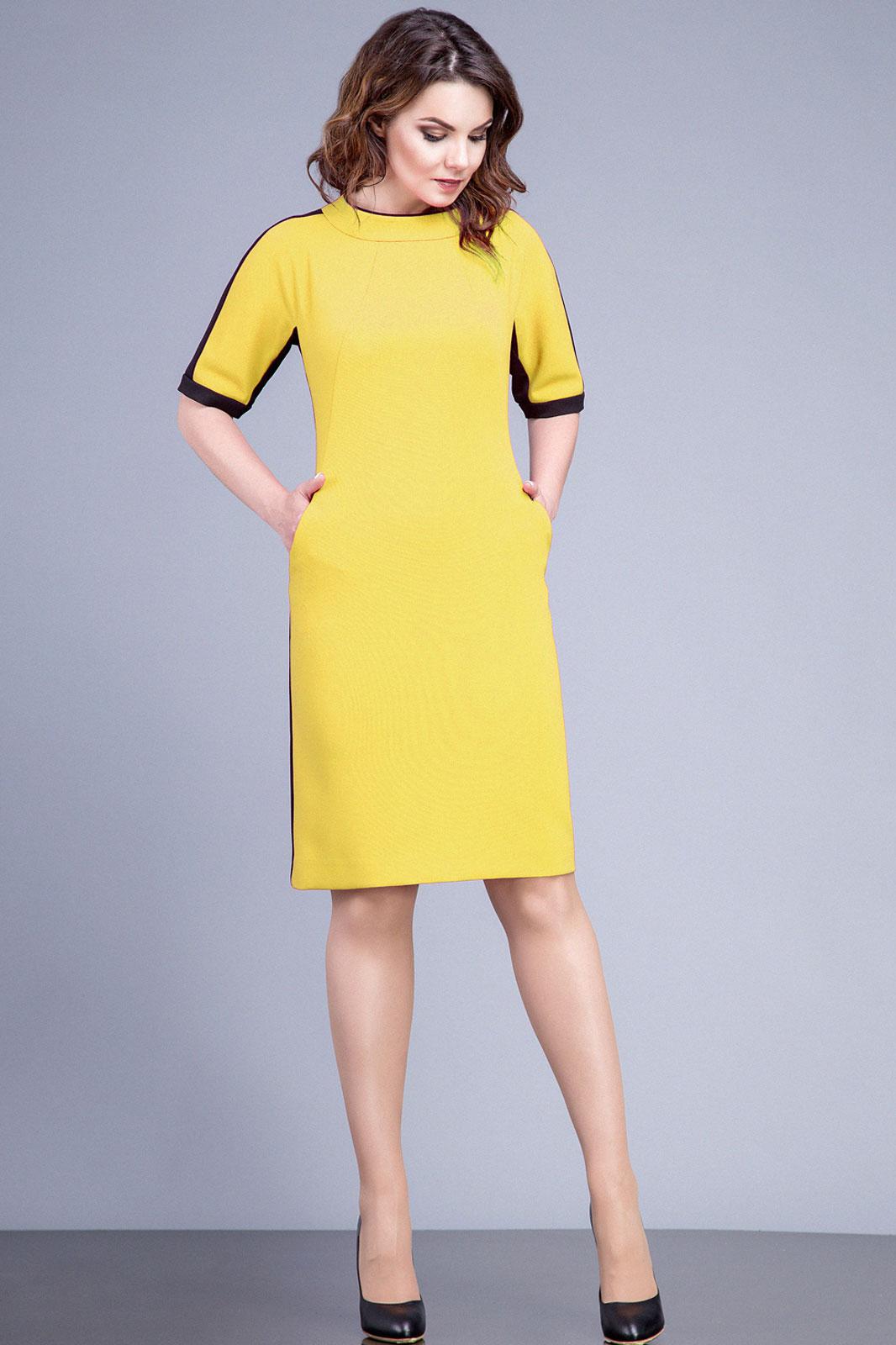 Модное яркое платье А-образного силуэта, длиной чуть выше середины колена. Рукав цельнокроеный, длиной до уровня локтя. По переду платье с фигурными рельефами, в которых обработаны карманы. Воротник-стойка, которая украшена бантом и брошью. Боковая часть из отделочной ткани, переходящая в ластовицу рукава. Верхняя часть рукава и притачная манжета также из отделочной ткани. Спинка со средним швом и талиевыми вытачками. Потайная застежка молния в среднем шве.