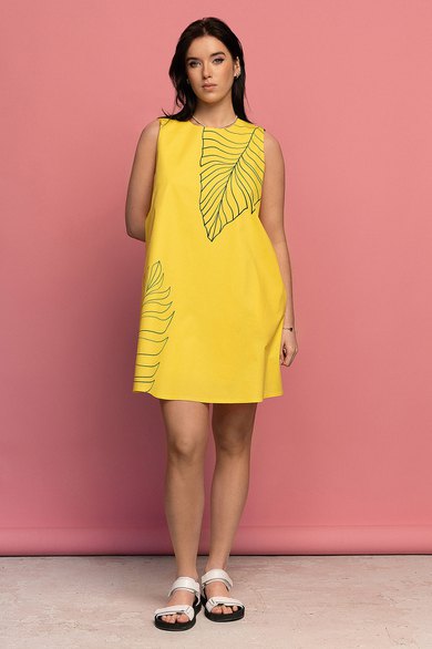 Платье женское трапециевидного силуэта без рукавов,длиной до колен.Перед и спинка с расширением по линии низа с карманами в бок.швах.Спинка со средним швом и разрезом в верхней части, пройма квадратной формы. Принт лист по по переду верх-левом плече