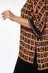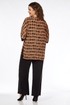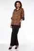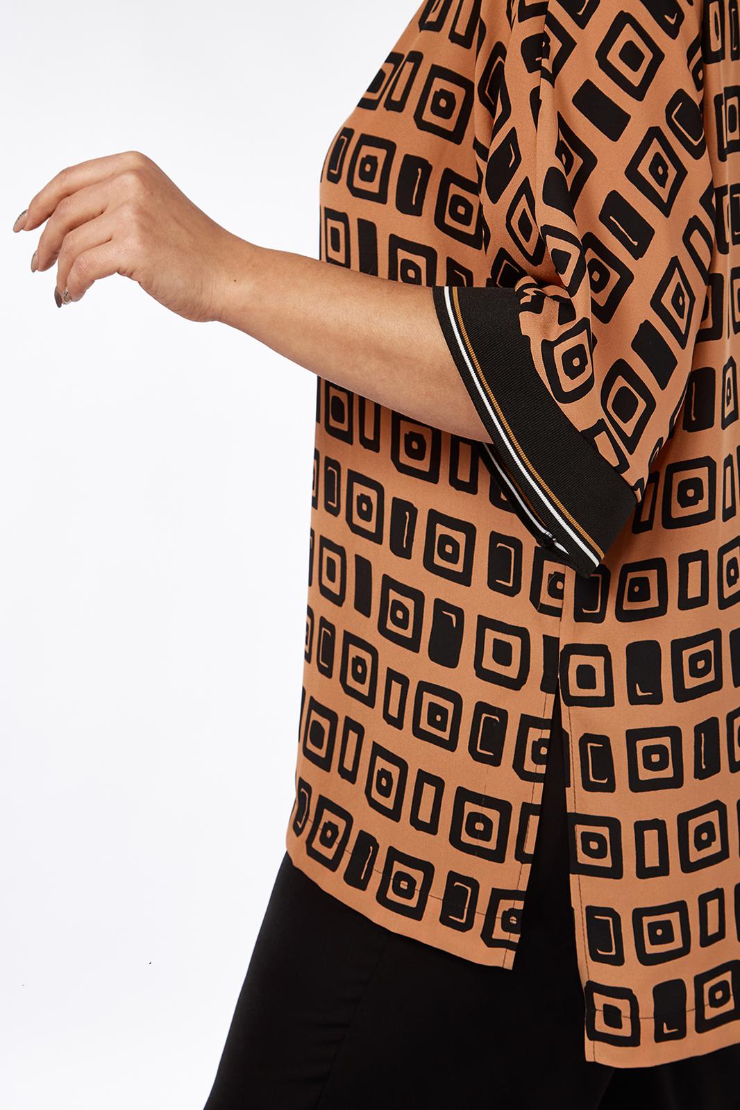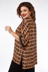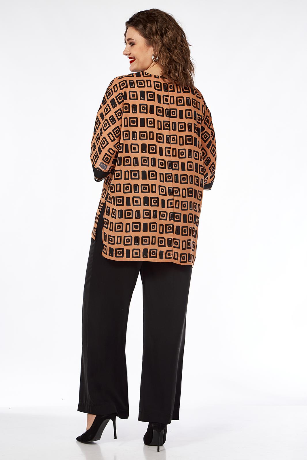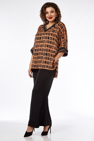 Комплект брючный, состоит из туники и брюк. Туника свободного силуэта из блузочной ткани. Горловина V-образной формы. По низу рукавов и горловине вставлен довяз. Рукава — цельнокроеные. В боковых швах внизу блузы обработаны разрезы. Брюки средней посадки, прямые. В передних деталях брюк расположены карманы. Пояс на резинке.