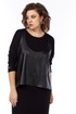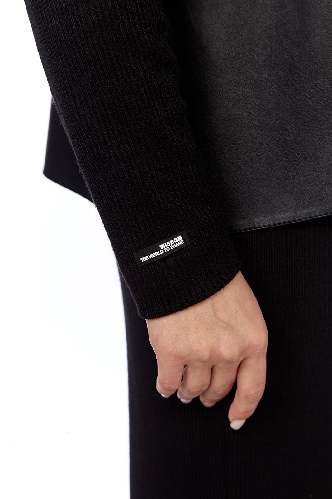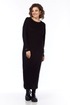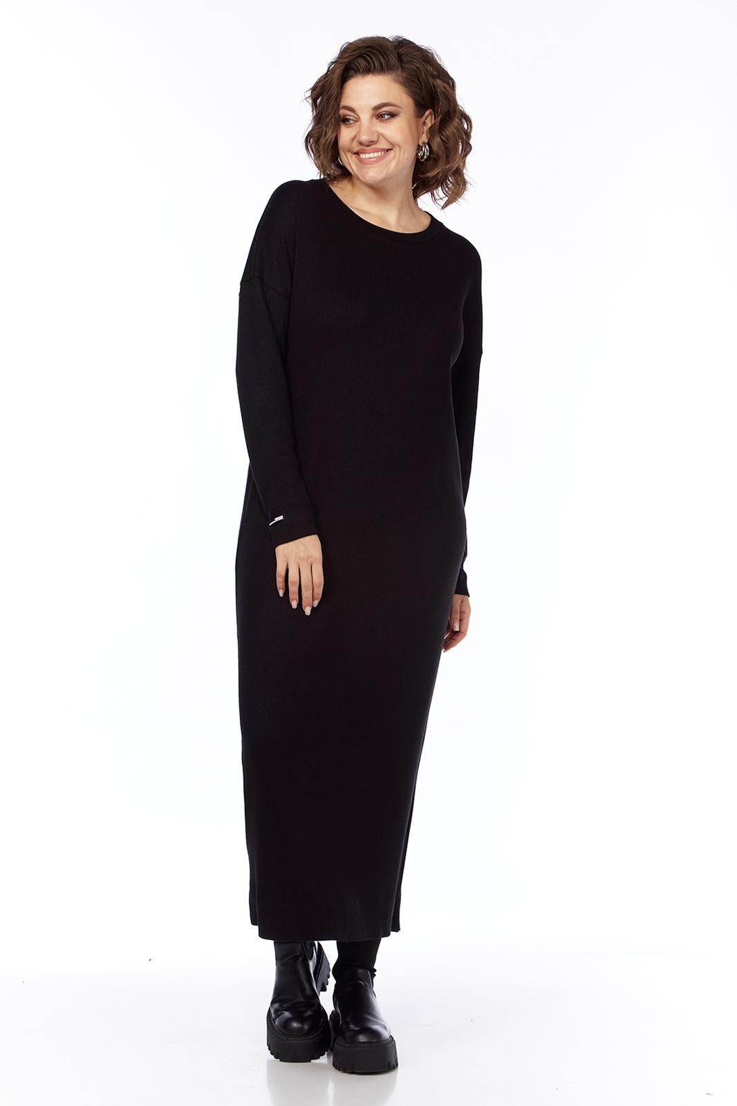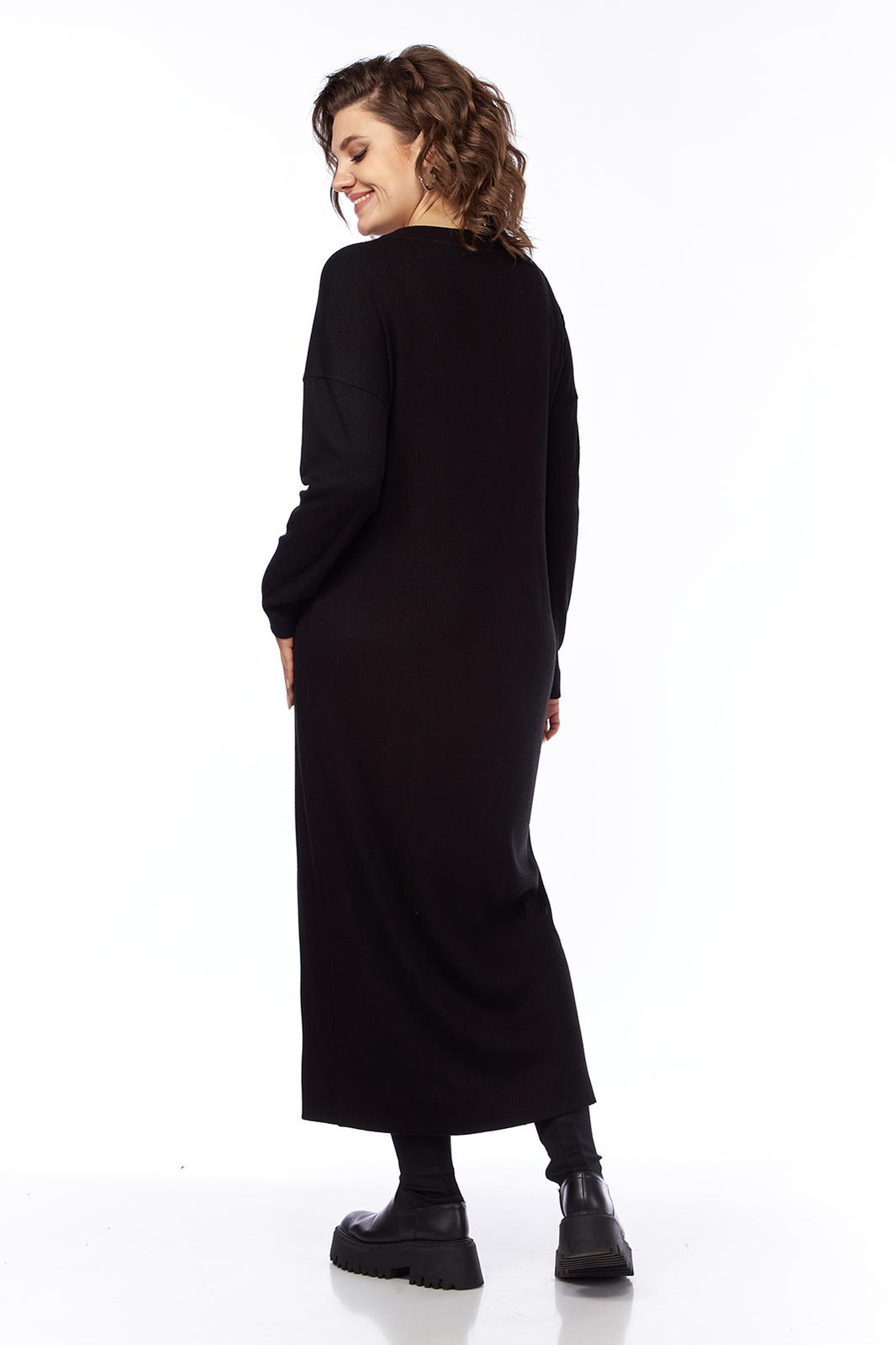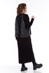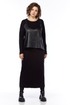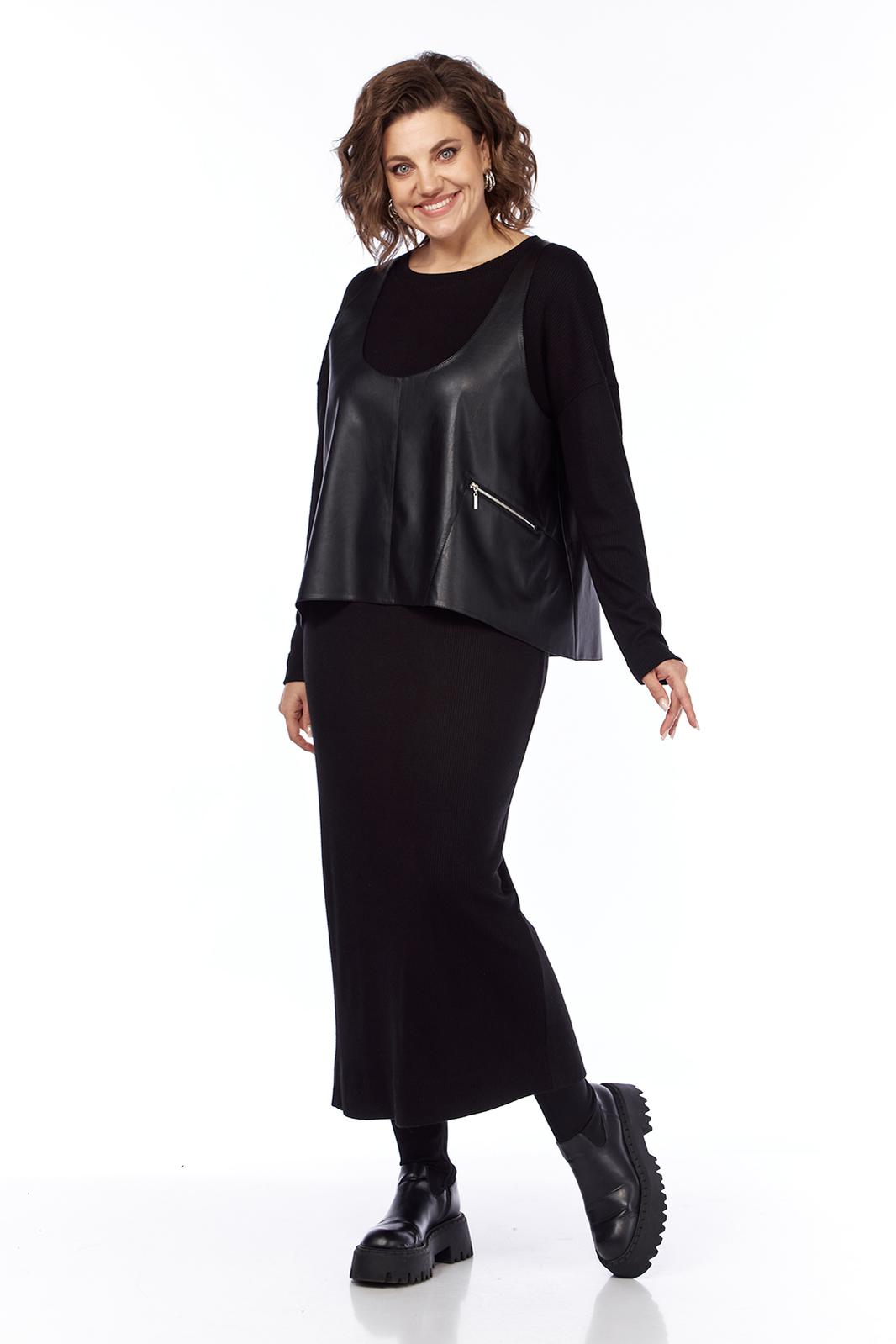 Комплект женский двухпредметный состоит из платья и жилетки. Платье свободного силуэта выполнено из трикотажного полотна ( лапша ). Перед и спинка цельнокроеные. Рукава спущенные. Жилетка выполнена из искусственной кожи на вискозной основе, А — силуэта. Перед со средним швом и асимметричным декоративным элементом. Спинка разрезная по центру.
