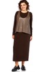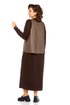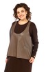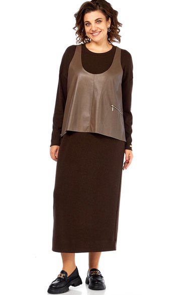 Комплект женский двухпредметный состоит из платья и жилетки. Платье свободного силуэта выполнено из трикотажного полотна ( лапша ). Перед и спинка цельнокроеные. Рукава спущенные. Жилетка выполнена из искусственной кожи на вискозной основе, А — силуэта. Перед со средним швом и асимметричным декоративным элементом. Спинка разрезная по центру.