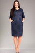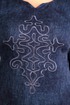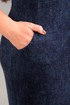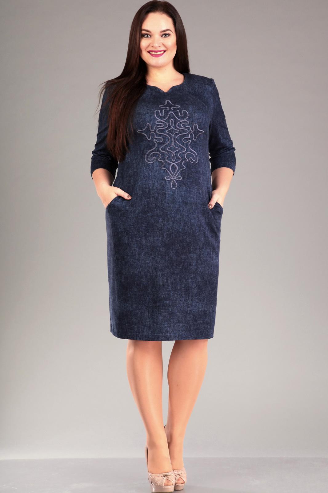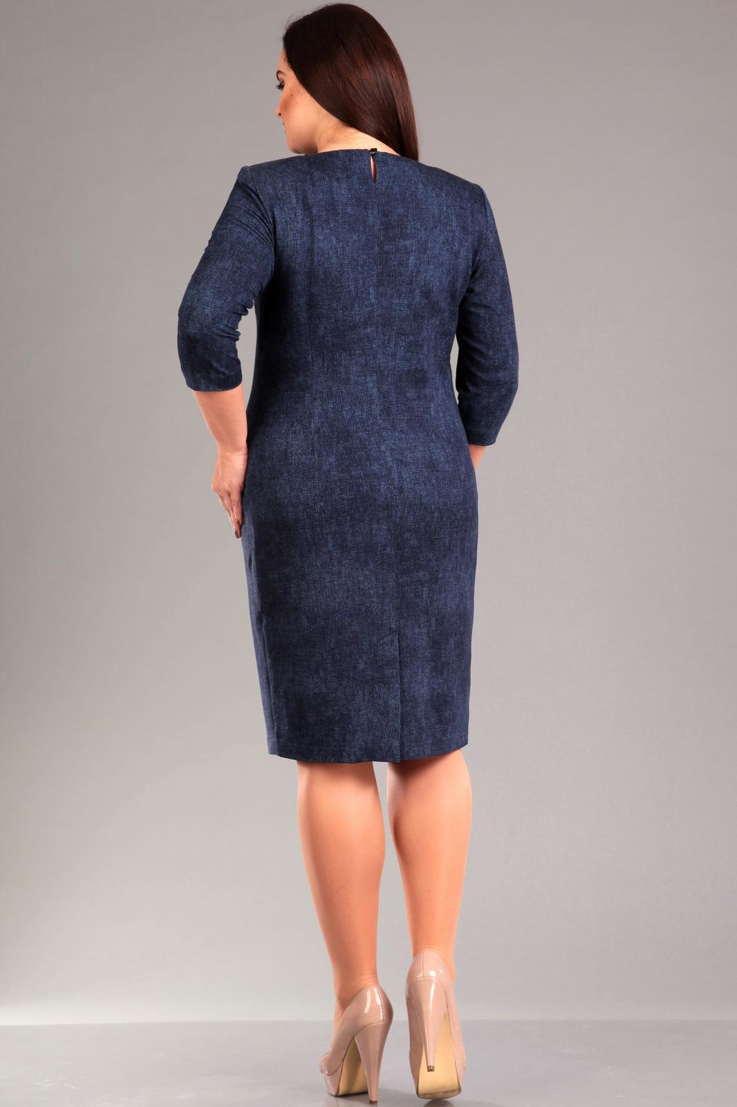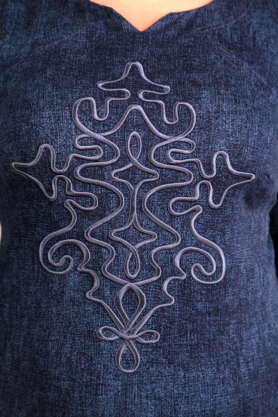 Платье женское полу прилегающего силуэта из трикотажного полотна окрашенного под джинс. На полочке выполнены фигурные подрезы и карманы в шве рельефа. На спинке средний шов со шлицей по низу и застежкой сверху на навесную петлю. На полочке выполнена вышивка. Рукав 3/4. Длина изделия по спинке 104 см. Длина рукава - 44 см.