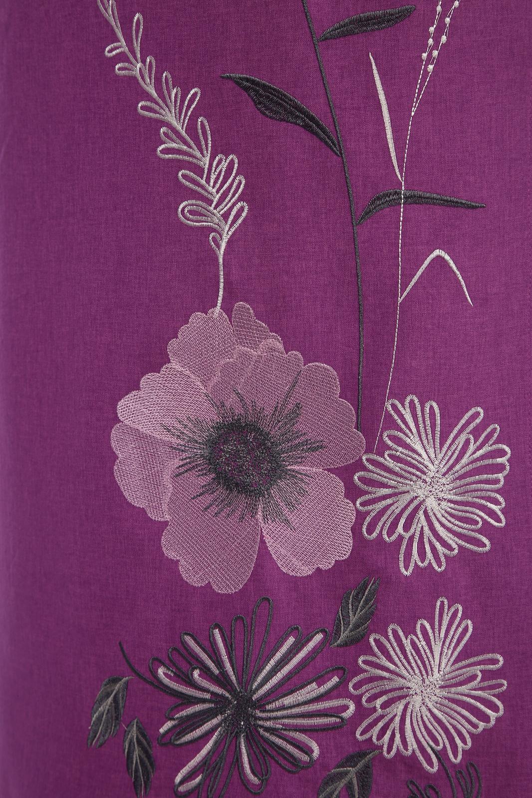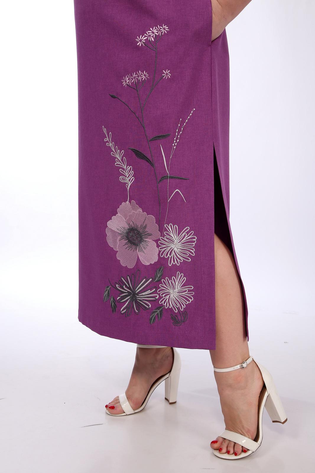 Платье женское прямого силуэта. Горловина фигурной формы. Рукав втачной, разрезной, короткий. По переду нагрудные вытачки и кокетки. Спинка со средним швом. В боковых швах обработаны карманы и разрезы. Платье декорировано дизайнерской вышивкой.