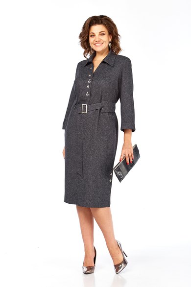 Платье женское прямого силуэта, изготовлено из плательной ткани. По переду нагрудные вытачки и фигурные подрезы с карманами в швах. Горловина оформлена планками с декоративной вышивкой и пуговицами, воротник стояче-отложной. На талии декоративные шлевки и съемный пояс с пряжкой. По спинке кокетка и средний шов. В боковых швах внизу обработаны шлицы декорированы пуговицами.
