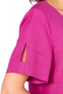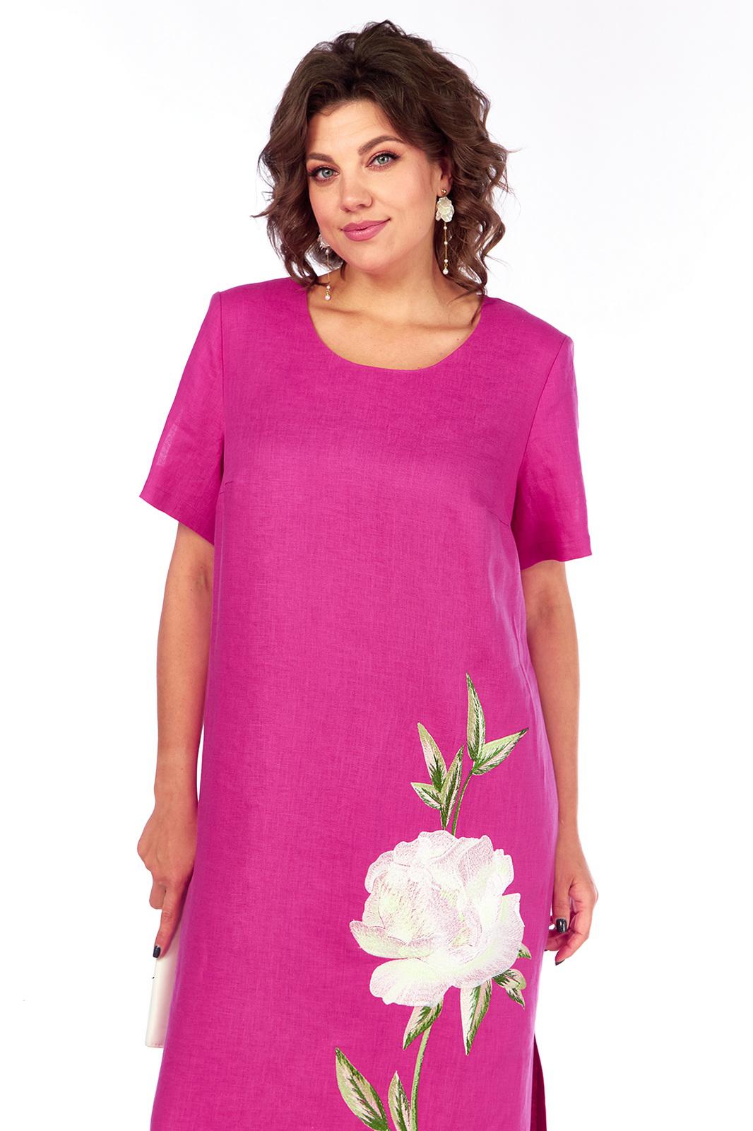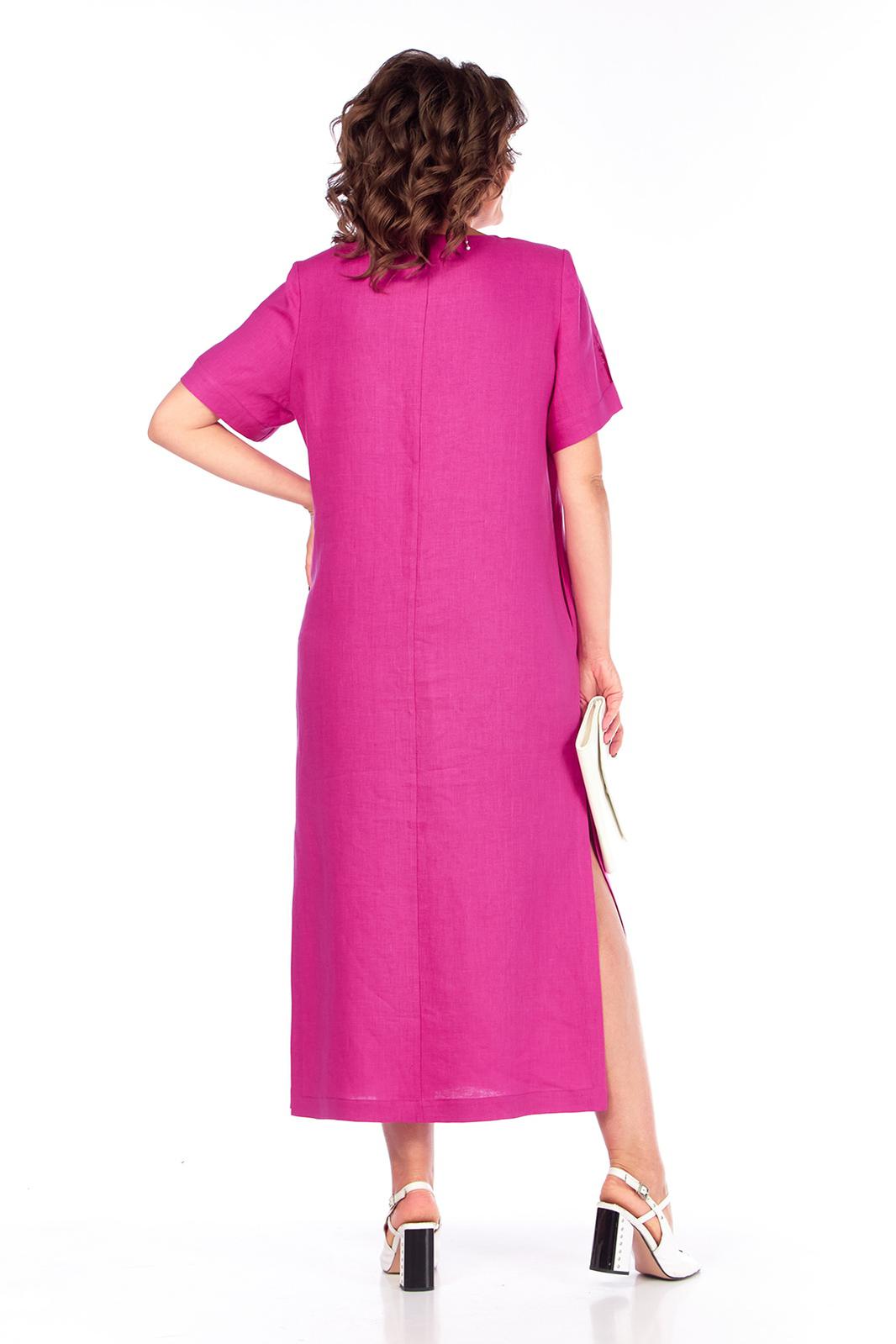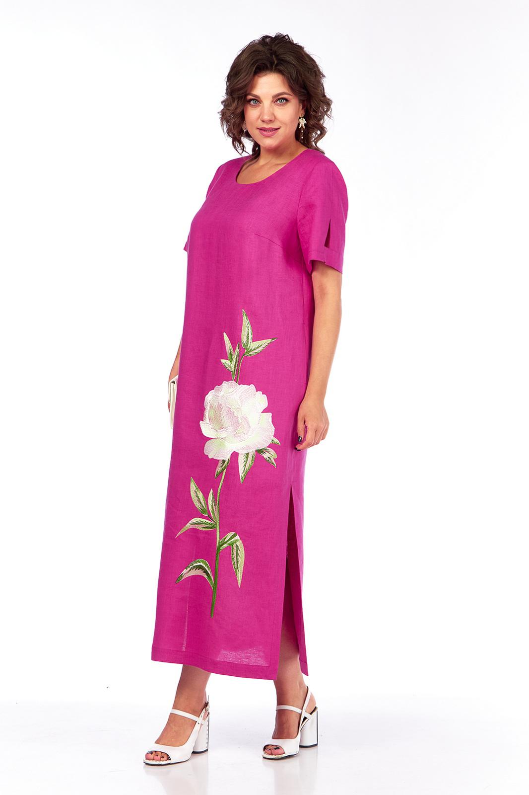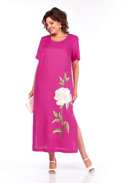 Платье женское прямого силуэта, изготовлено из натуральной ткани. Горловина круглой формы. По переду обработаны нагрудные вытачки. На спинке средний шов. В боковых швах обработаны карманы, внизу разрезы. Рукава втачные, разрезные с фигурным вырезом. Платье декорировано дизайнерской вышивкой.