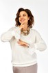 Джемпер женский, нарядный, выполнен из трикотажного полотна с искринкой. Перед и спинка цельнокроеные. Горловина круглой формы. Рукава втачные, по низу декоративные элементы с кружевом. Низ изделия с притачной деталью.