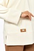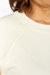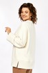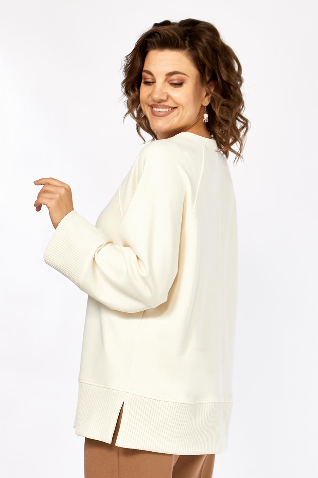 Джемпер женский, свободного кроя, изготовлен путем комбинирования трикотажного полотна. Горловина круглой формы. Рукава — реглан. В боковых швах обработаны разрезы внизу. Горловина, низ изделия и низ рукавов изготовлены из отделочного трикотажного полотна. Отделка нашивка по переду.