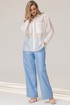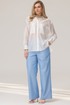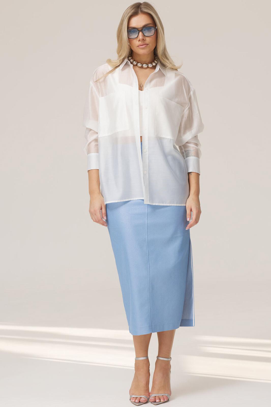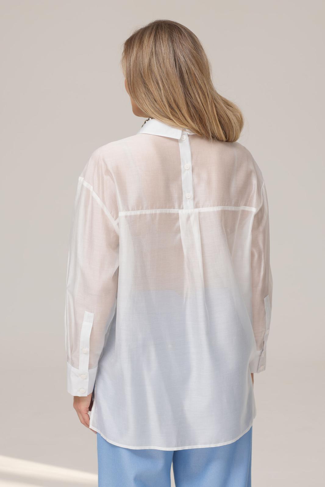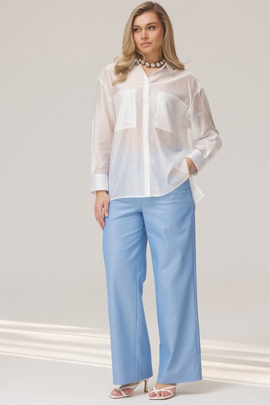Блузка женская, прямая, с центральной застежкой на петли и пуговицы. По переду в области груди настрочены накладные карманы. Спинка с отрезной кокеткой, кокетка с центральной застежкой на петли и пуговицы. Нижняя часть спинки со складкой. Плечевой шов смещен на перед, линия плеча спущена. Рукав притачной, по низу обработан широкой манжетой, которая застегивается на петли и пуговицы. Горловина округлой формы, обработана воротниками (2) рубашечного типа с отрезной стойкой. По боковым швам отстрочены разрезы, перед короче спинки.Декоративные элементы и фурнитура могут отличаться от заявленных на фото. Цвет материала может отличаться по тону в зависимости от настроек вашего монитора!