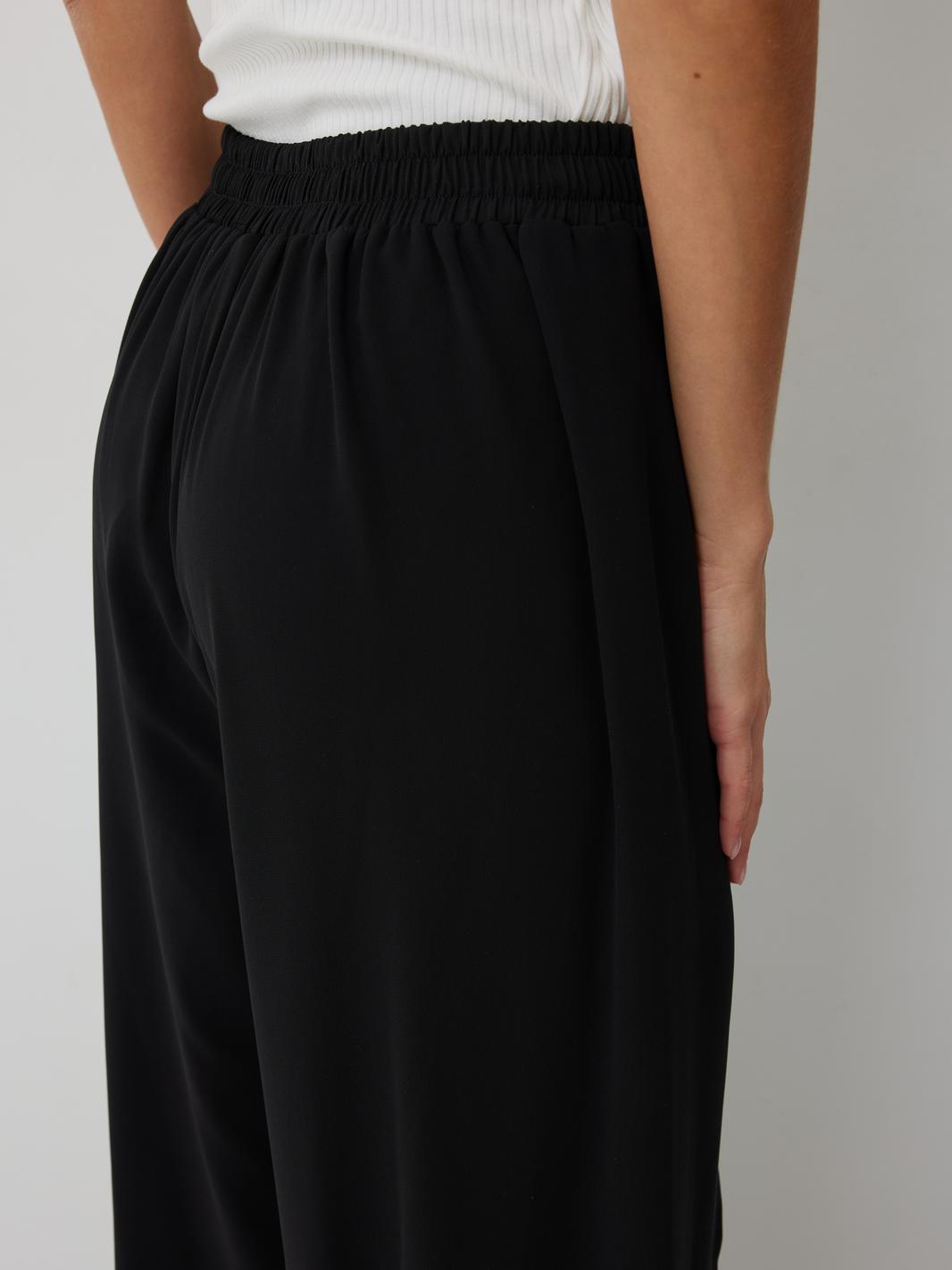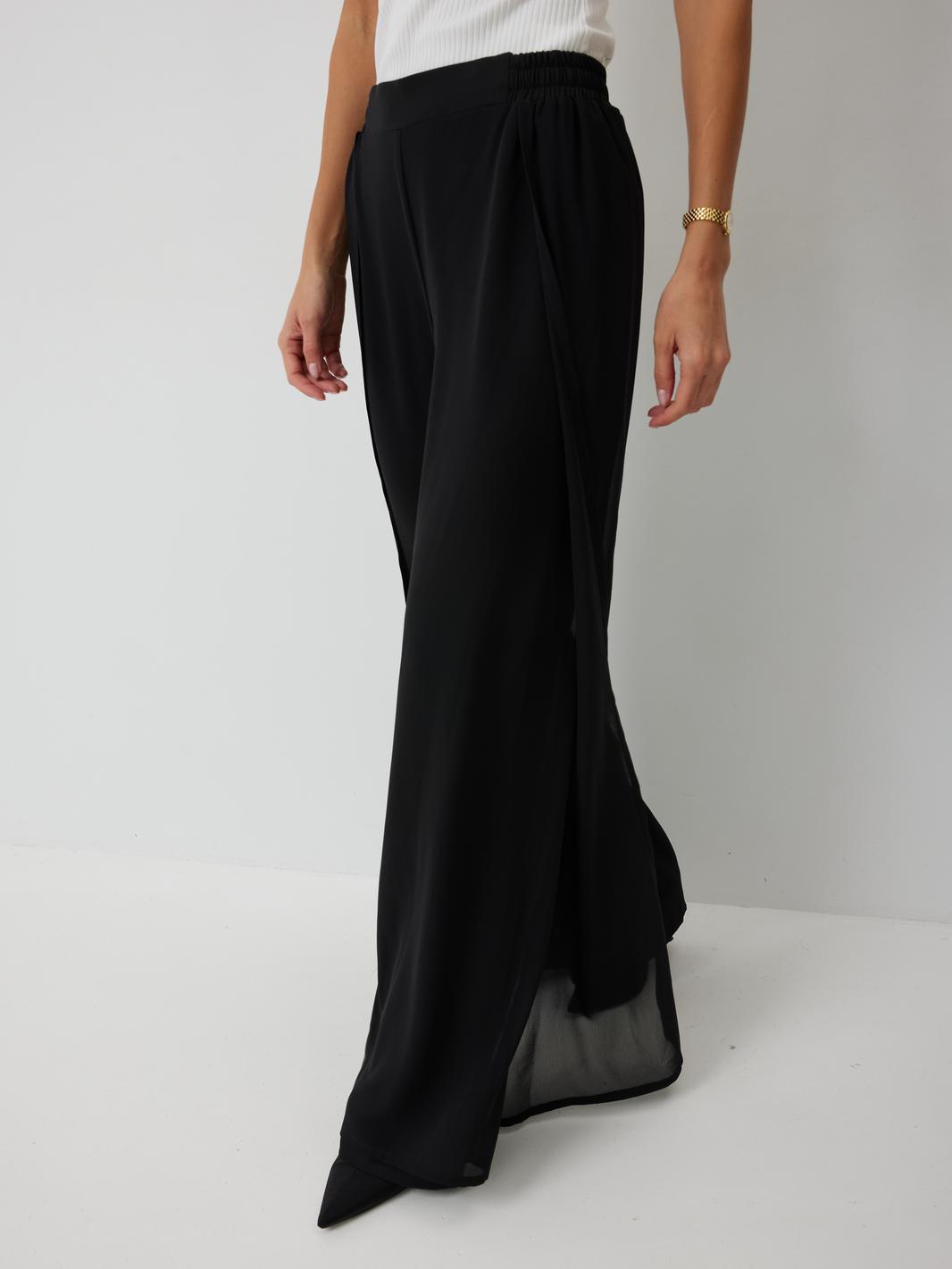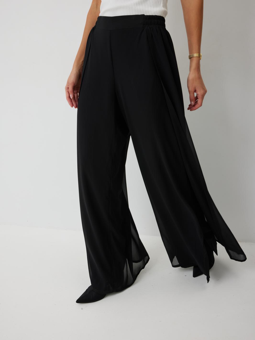 Брюки прямого силуэта, выполнены из шифоновой ткани на подкладке полной длинны. Боковой шов брюк открыт. Синка брюк заходит на перед по верхней части. Подкладка из не просвещающейся креповой ткани. Верх брюк обработан отрезным поясом. Центральная часть пояса без резинки, остальной пояс на резинке. Низ брюк обработан швом « в подгибку».