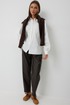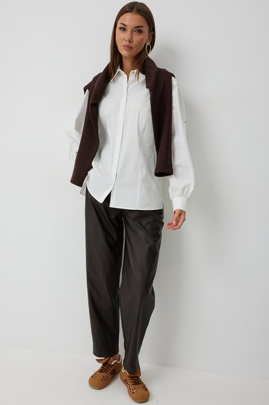 Брюки женские из искусственной кожи зауженные к низу. На передних частях брюк обработаны карманы с отрезным бочком и застрочены складки. По концам кармана установлены хольнитены. По спинке брюк накладные карманы с хольнитенами на концах и отрезной кокеткой. Верхний срез брюк обработан отрезным поясом со шлевками. Брюки застегиваются по переду на «молнию» в гульфике и кнопку по поясу.