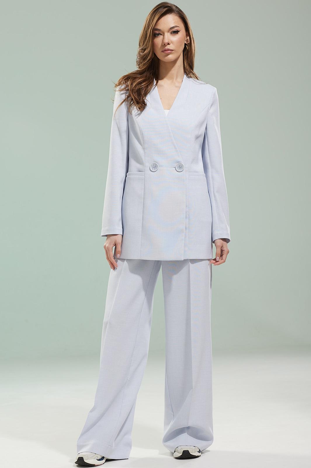 Жакет двубортный с центральной застежкой на 2 петли и 2 пуговицы, с воротником-стойкой. По переду обработаны рельефы, карманы с листочкой. Спинка разрезная. Рукав длинный, двухшовный, с имитацией шлицы декорированной пуговицами. Брюки женские, расширенные. По переду обработана застежка на молнию, обработаны карманы с наклонным входом, заутюжены стрелки. На задних половинках брюк застрочены вытачки, заутюжены стрелки. Верх обработан широким притачным поясом (частично на резинке), застегивающимся на петлю и пуговицу.