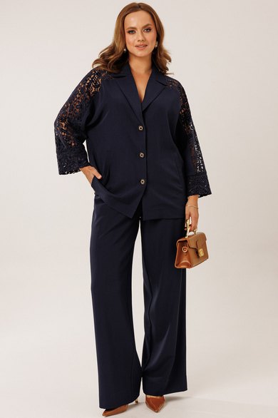 Костюм состоит из жакета с брюками. Жакет однобортный без подкладки, прямого силуэта с цельнокроеными рукавами. На полочках жакета обработаны наклонные прирезные карманы «в рамку» с листочкой. Кокетка полочки переходящая в кокетку спинки и верхнюю часть рукава из набивного гипюра в цвет основной ткани жакета. Манжета рукава так же из набивного гипюра. Спинка жакета прямая. Застежка на декоративные петли пуговицы. Горловина обработана втачным воротником с отрезной стойкой и лацканами. Брюки прямого силуэта от бедра с карманами в боковом шве. На передних половинках брюк заложены по 1 складке. По спинке брюк обработаны вытачки. Подгибка низа широкая. Застежка брюк на «молнию» в гульфике. Пояс брюк отрезной с частичной резинкой по спинке брюк.Цвет материала может отличаться по тону в зависимости от настроек вашего монитора!