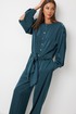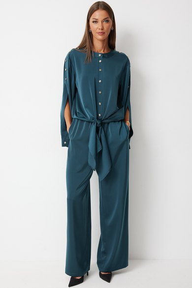Костюм женский состоящий из блузки и брюк. Блузка прямого силуэта с втачными фантазийными рукавами и разноуровневой линией низа. Блузка по переду предполагает завязку полочек и застегивается на петли пуговицы. Спинка блузки обработана резинкой по нижнему срезу. Горловина блузки обработана отрезной стойкой. Рукав с плечевым швом застегивается на декоративные пуговицы. По низу рукава расположена складка, рукав обработан притачной манжетой застегивающейся на петлю и пуговицу. Брюки прямого силуэта полной длинны В боковых швах брюк обработаны карманы. Верх брюк обработан отрезным поясом «на резинке». Цвет материала может отличаться по тону в зависимости от настроек вашего монитора