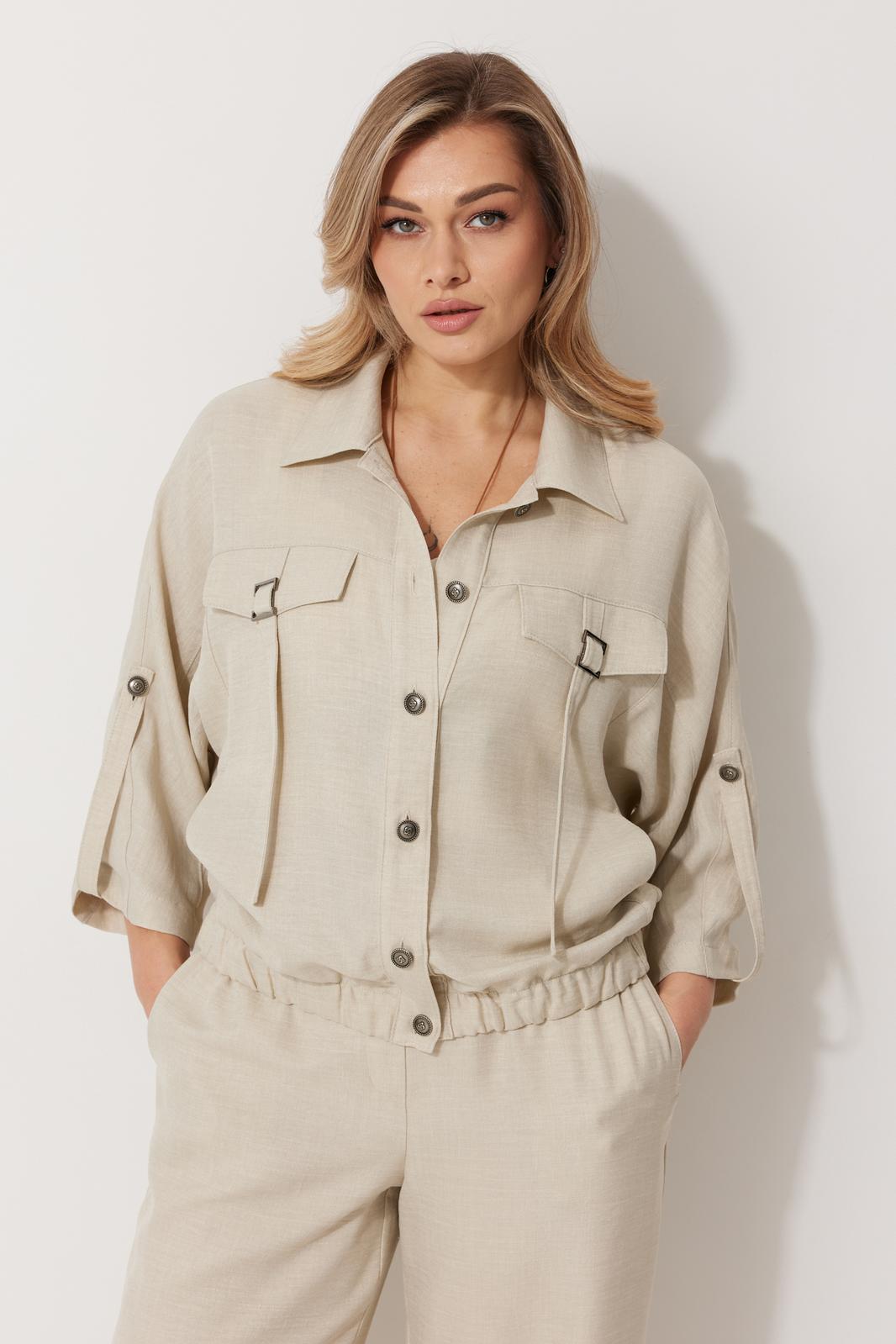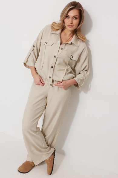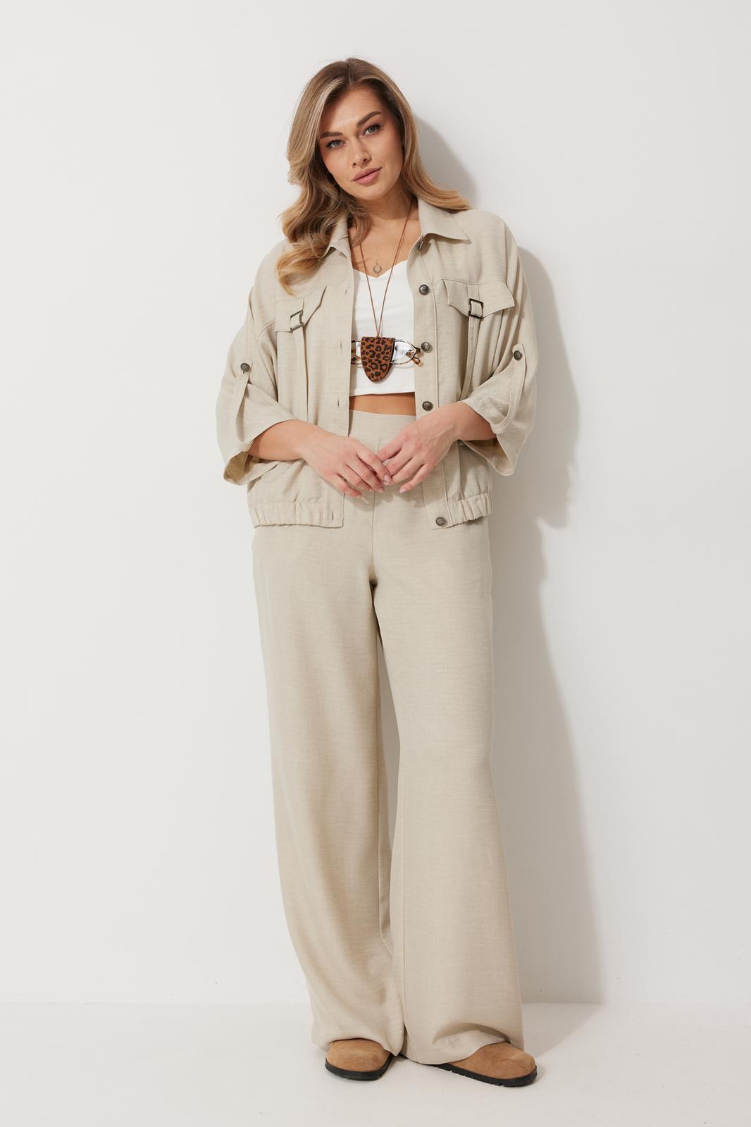 Костюм женский, состоящий из жакета и брюк. Жакет без подкладки, кроя «летучая мышь» длиной до линии бедра. По переду отрезные бочки с карманами «в шве». В шве кокетки полочки располагаются клапаны с декоративными элементами и хлястиком. Спинка с отрезными бочками и кокеткой. Рукав цельнокроеный 7/8длины, состоящий из четырех частей с патой по низу , застегивающейся на петлю и пуговицу. Низ жакета обработан резинкой. Застежка центральная на отрезные планки, застегивающиеся на петли и пуговицы. Горловина обработана втачным воротником с цельнокроеной стойкой. Брюки женские, прямого силуэта. По переду обработана имитация застежки. Карманы расположены в боковом шве. На задних половинках брюк застрочены вытачки. Верх обработан притачным поясом (частично на резинке).