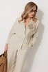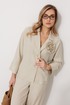 Костюм женский, состоящий из жакета и брюк. Жакет без подкладки, кроя «летучая мышь», с центральной однобортной застежкой на петли и пуговицы. По переду обработаны вертикальные прорезные карманы с листочкой. Спинка цельнокроеная, слева расположен декор в виде авторской броши. Горловина V-образной формы, обработана воротником пиджачного типа. Рукав 7/8, по низу обработан широкой притачной манжетой. Брюки женские, расширенные. По переду обработана застежка на молнию, обработаны карманы с наклонным входом. На задних половинках брюк застрочены вытачки. Верх обработан широким притачным поясом (частично на резинке), застегивающимся на петлю и пуговицу.