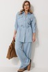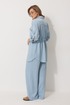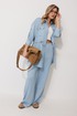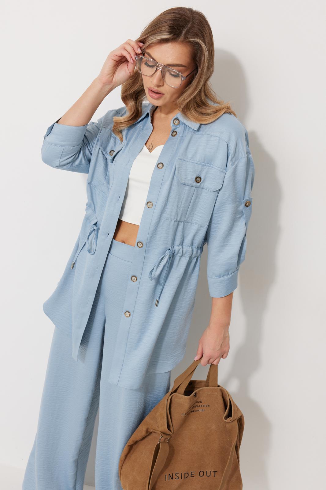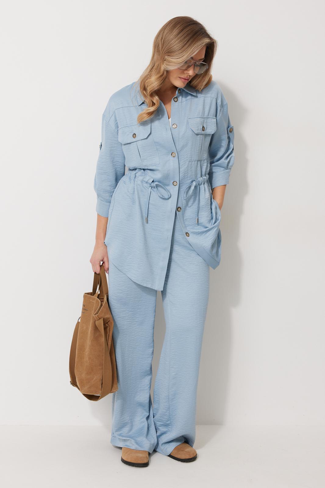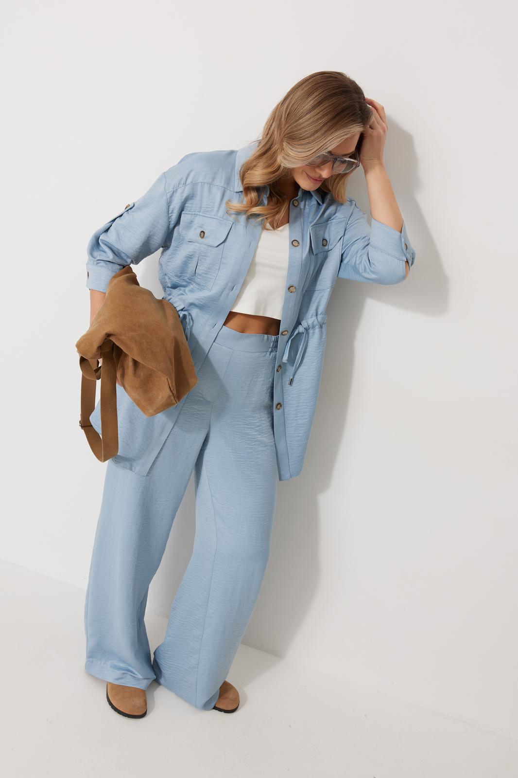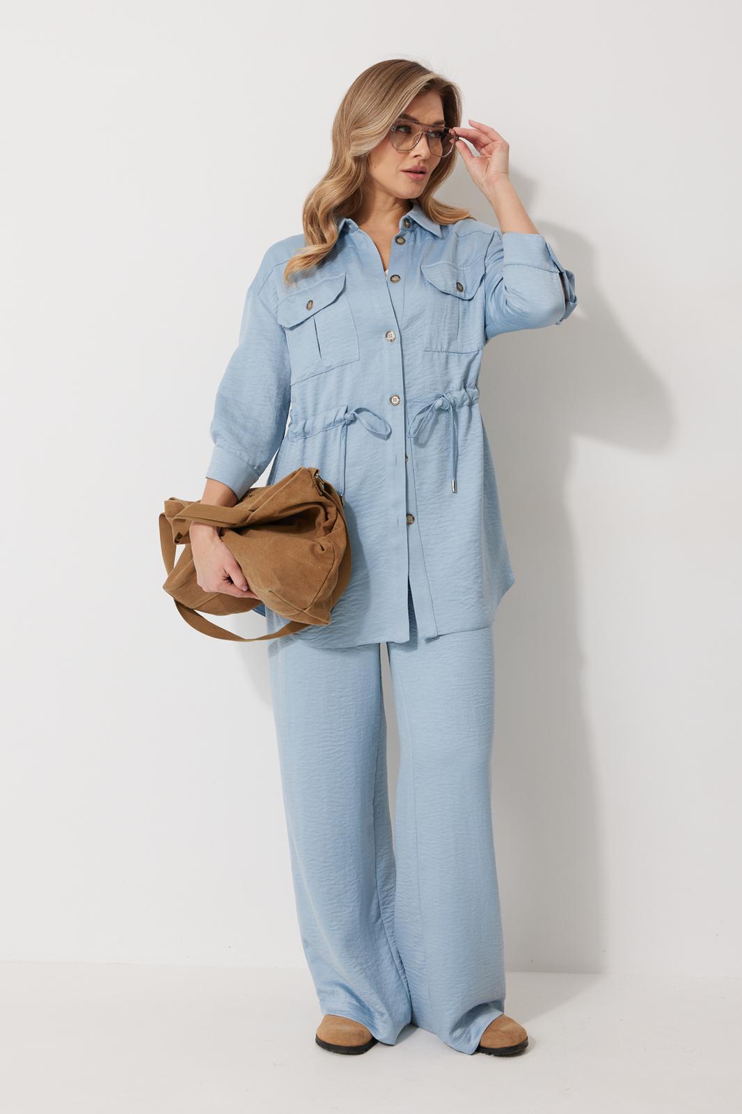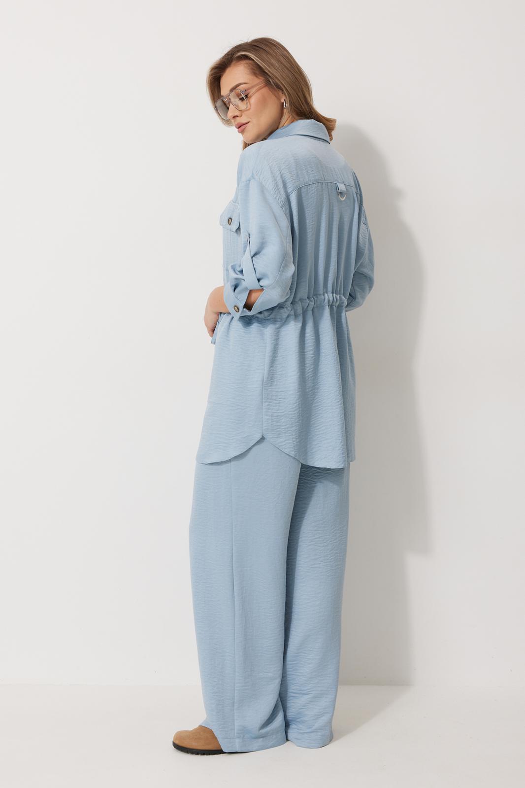 Костюм женский состоящий из блузки с брюками. Блузка прямого силуэта, по спущенной линией плеча, длиной за линию бедра. По переду блузки настрочены накладные карманы с клапаном. Клапан застегивается на петлю и пуговицу. По спинке отрезная кокетка с декоративным элементом. По переду и спинке, в районе талии располагается кулиска. Рукав втачной двухшовный ¾ длины. Низ рукава со складкой обработан притачной манжетой, застегивающейся на петлю и пуговицу. В разрезе рукава располагается пата, застегивающаяся на петлю и пуговицу. Застежка блузки центральная на отрезные планки, застегивающиеся на петли и пуговицы. Горловина блузки обработана рубашечным воротником с отрезной стойкой. Брюки женские, прямого силуэта. По переду обработана имитация застежки. Карманы расположены в боковом шве. На задних половинках брюк застрочены вытачки. Верх обработан притачным поясом (частично на резинке).