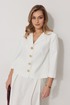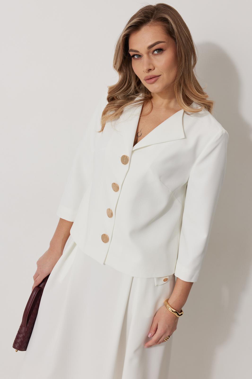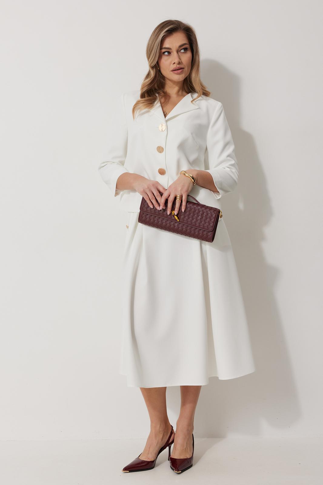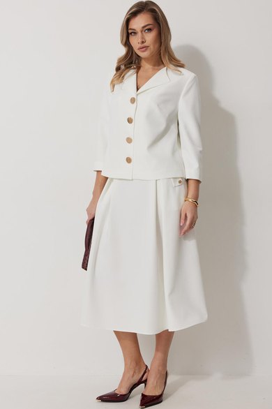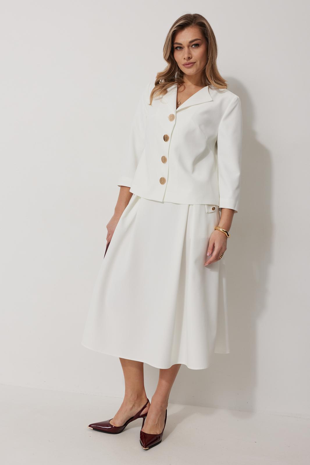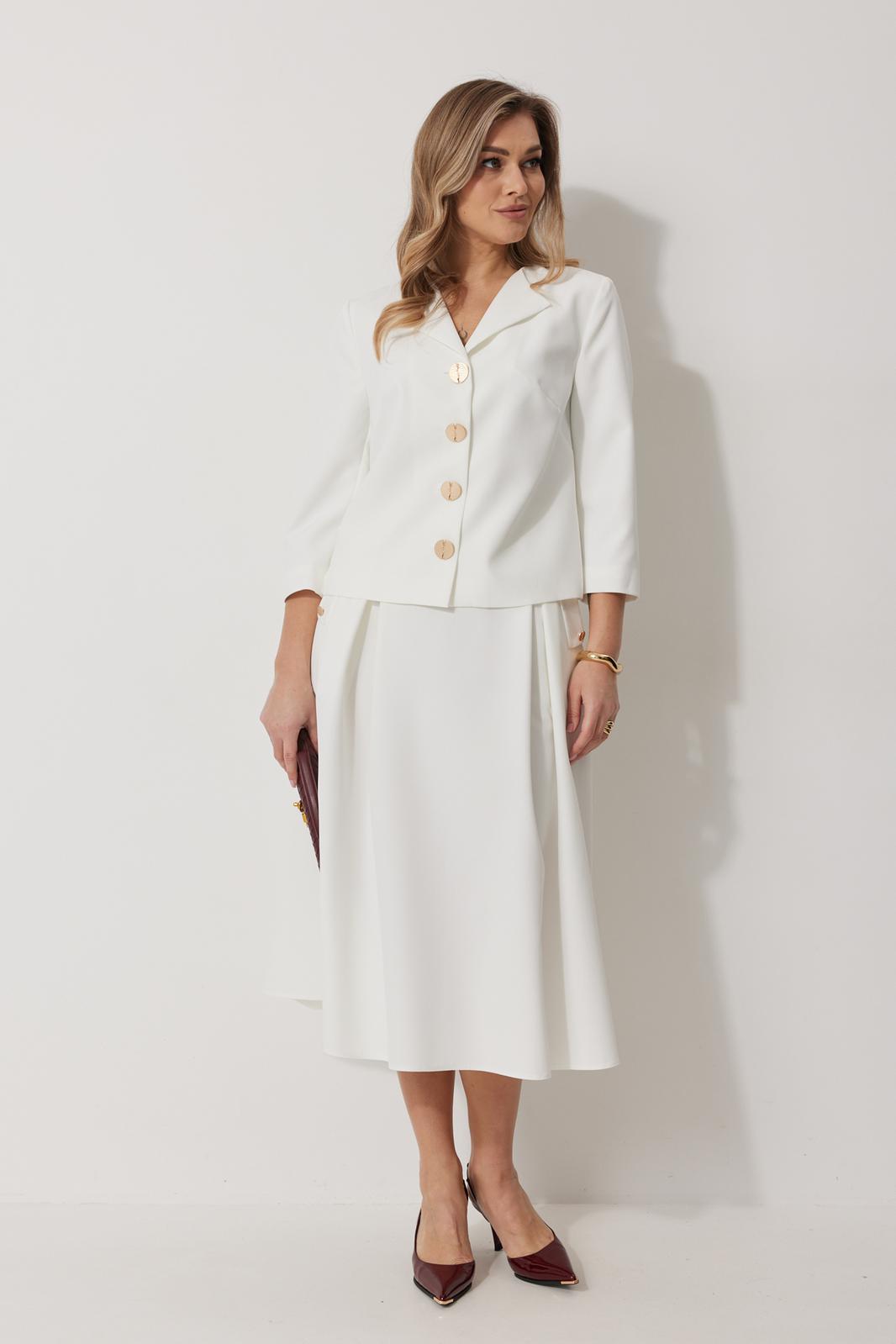 Костюм женский, состоящий из жакета и юбки. Жакет на подкладке, с рукавом и центральной однобортной застежкой на петли и декоративные пуговицы. Длина жакета до линии бедра. По переду обработаны наклонные вытачки. Спинка со средним швом. Горловина V-образной формы с отворачивающимися лацканами. Линия горловины обработана обтачкой. Рукав втачной, двухшовный ¾ длины. Юбка женская на подкладке А – силуэта длиной до середины икры. По переду юбки заложены встречные складки и нстрочены клапаны с декоративными пуговицами. Спинка юбки цельная. Карманы обработаны в боковом шве юбки. По левому боковому шву юбки находится застежка – молния. Верхний срез юбки обработан притачным поясом с резинкой по спинке.