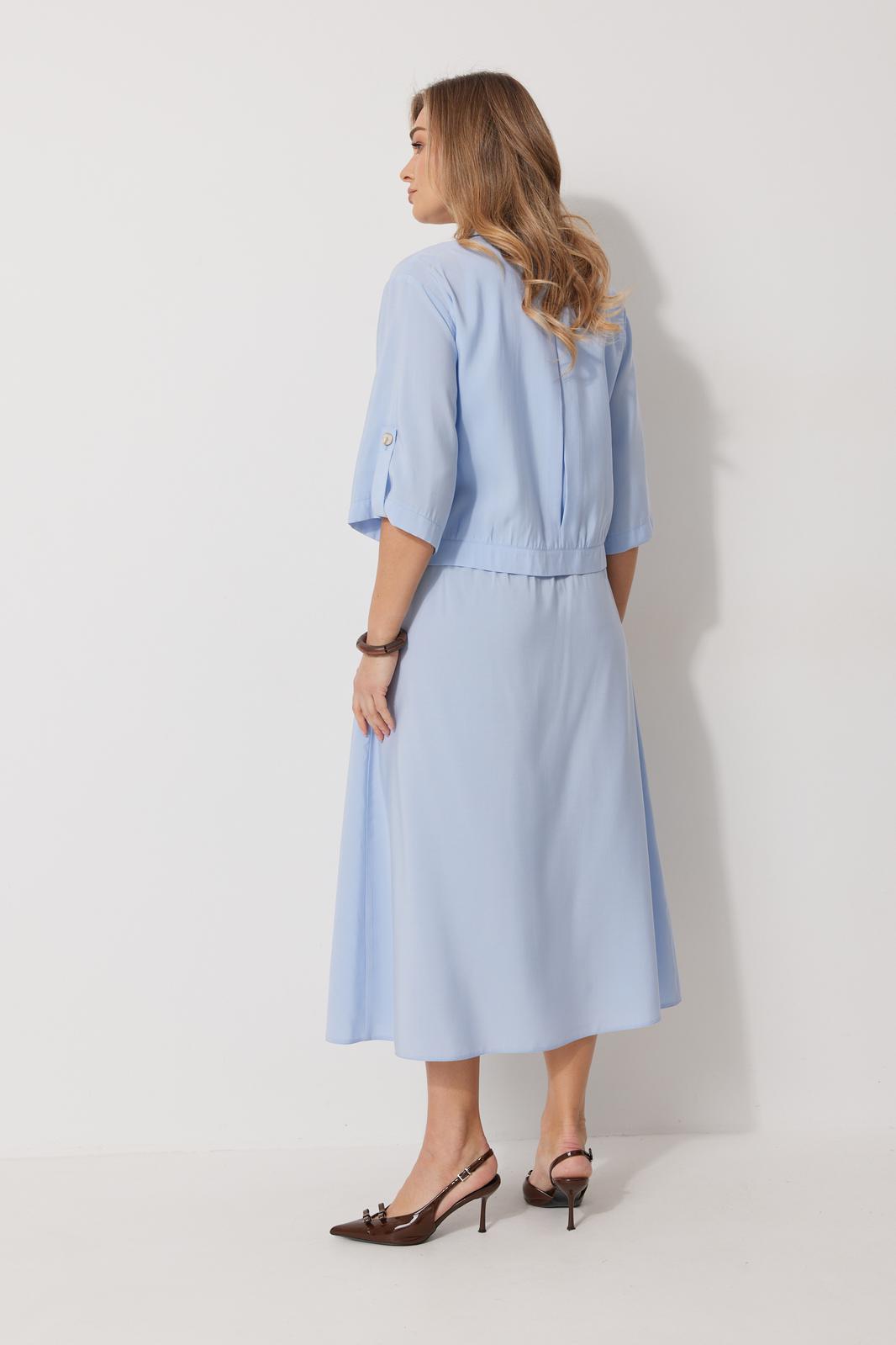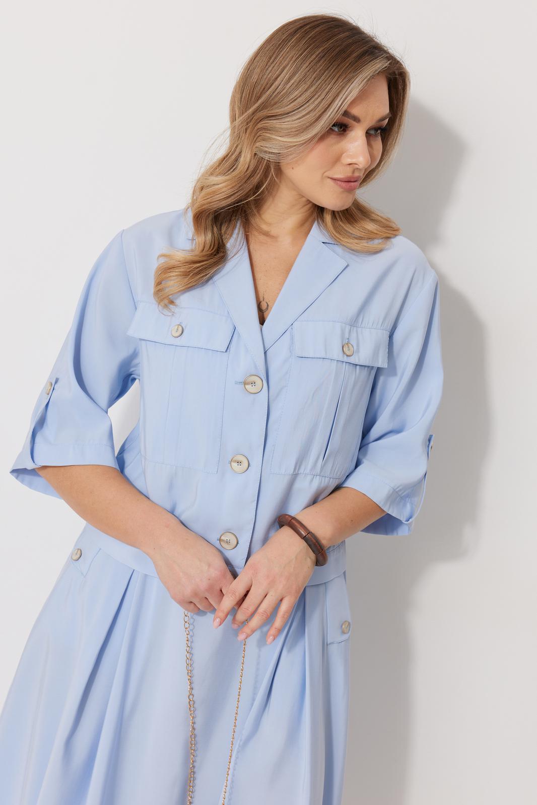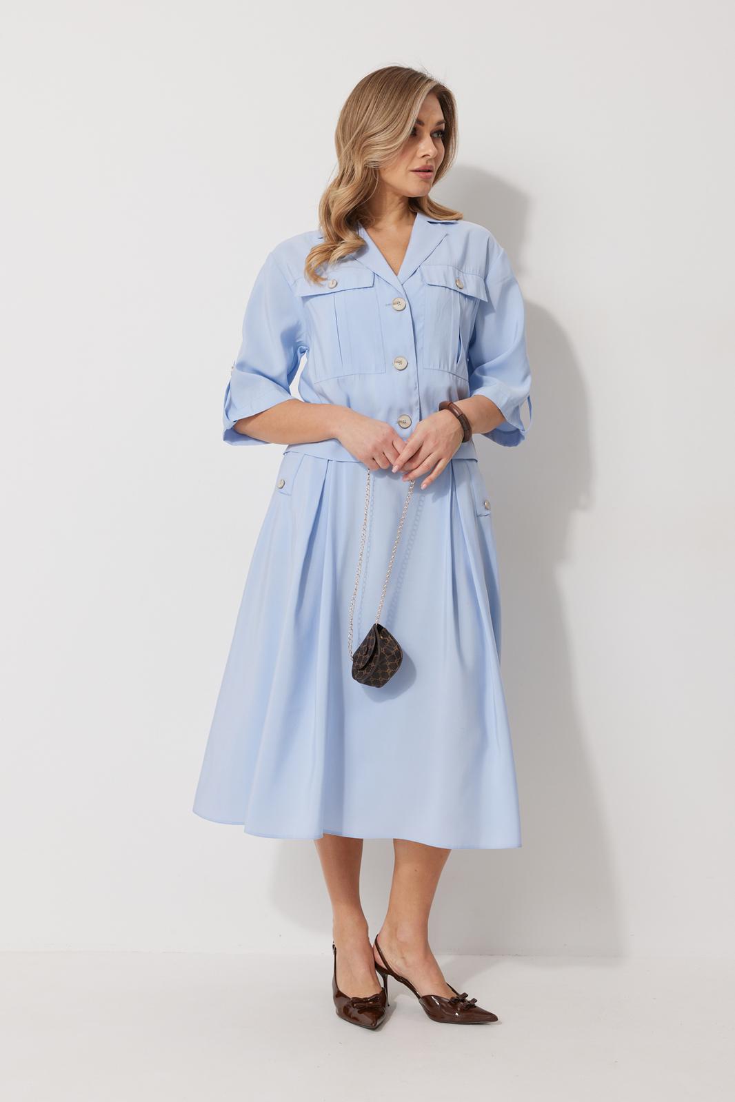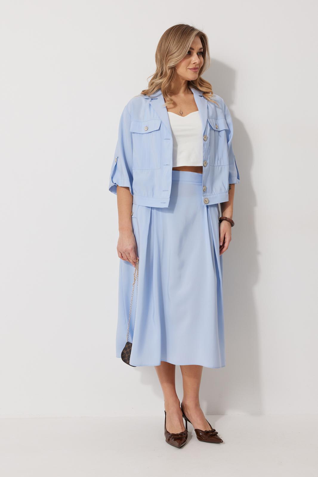 Костюм женский, состоящий из жакета и юбки. Жакет прямого силуэта без подкладки, длиной до линии бедра. По переду жакета настрочены накладные карманы с встречными складками. В шве притачивания кокетки расположен клапан кармана, застегивающийся на петлю и пуговицу. В среднем шве спинки расположена встречная складка. Рукав втачной одношовный, прямой. По низу рукава расположена пата, застегивающаяся на петлю и пуговицу. По низу жакета обработан отрезной пояс. Горловина обработана втачным воротником с лацканами. Застежка центральная , однобортная на петли пуговицы. Юбка женская на подкладке А – силуэта длиной до середины икры. По переду юбки заложены встречные складки и нстрочены клапаны с декоративными пуговицами. Спинка юбки цельная. Карманы обработаны в боковом шве юбки. По левому боковому шву юбки находится застежка – молния. Верхний срез юбки обработан притачным поясом с резинкой по спинке.