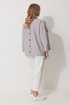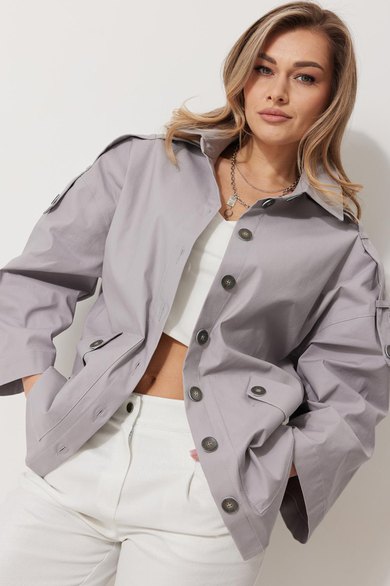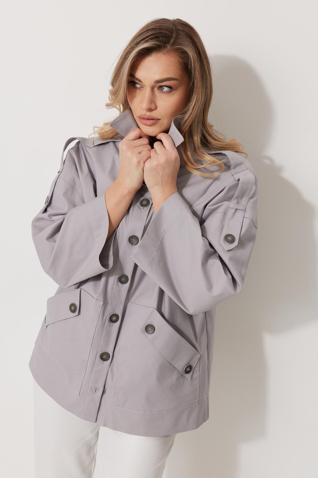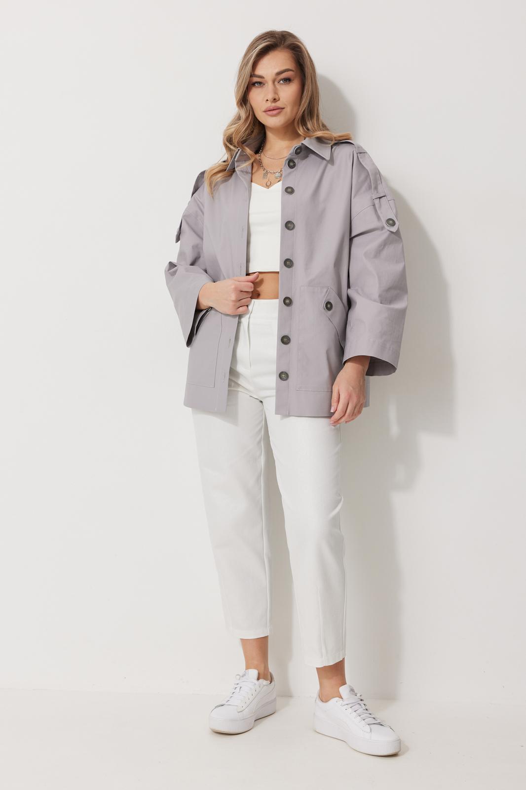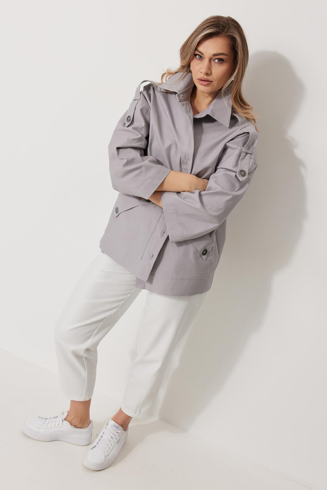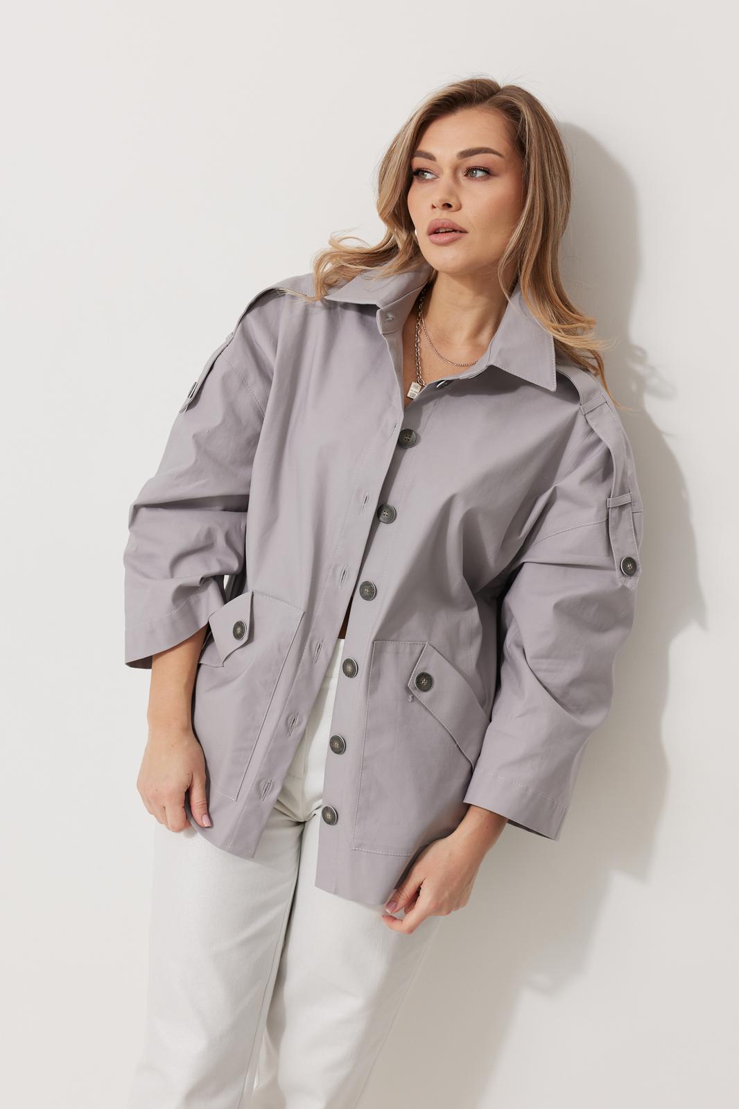 Жакет женский без подкладки прямого силуэта со спущенной линией плеча длиной за линию бедра. По переду жакета располагаются накладные карманы с цельнокроеным клапаном. Спинка с имитацией застежки по среднему шву и кокеткой. Рукав втачной одношовный прямой. По линии плечевого шва располагается пата со шлевками и пристегивается к рукаву на петлю и пуговицу. Перед жакета с центральной застежкой на цельнокроеные планки, застегивающиеся на петли пуговицы. Горловина обработана воротником рубашечного типа.