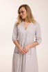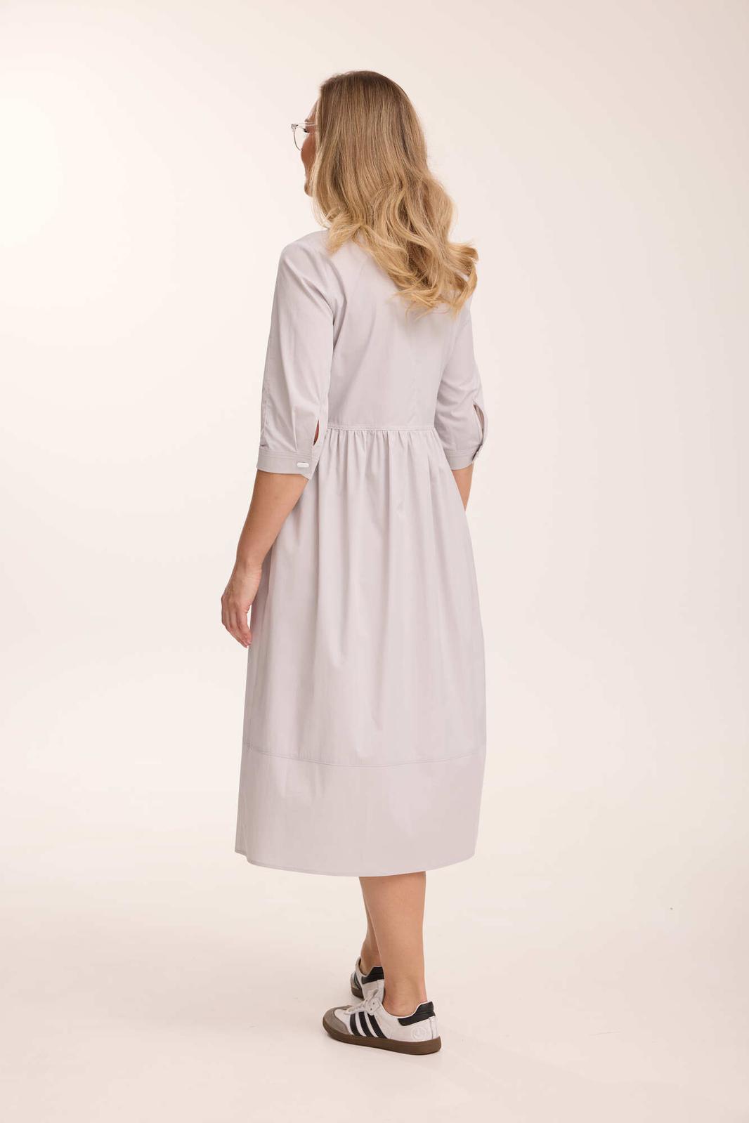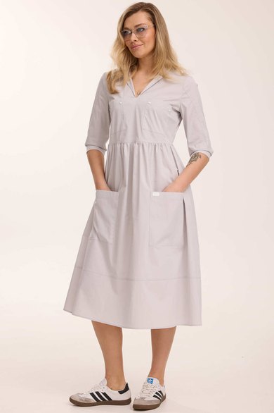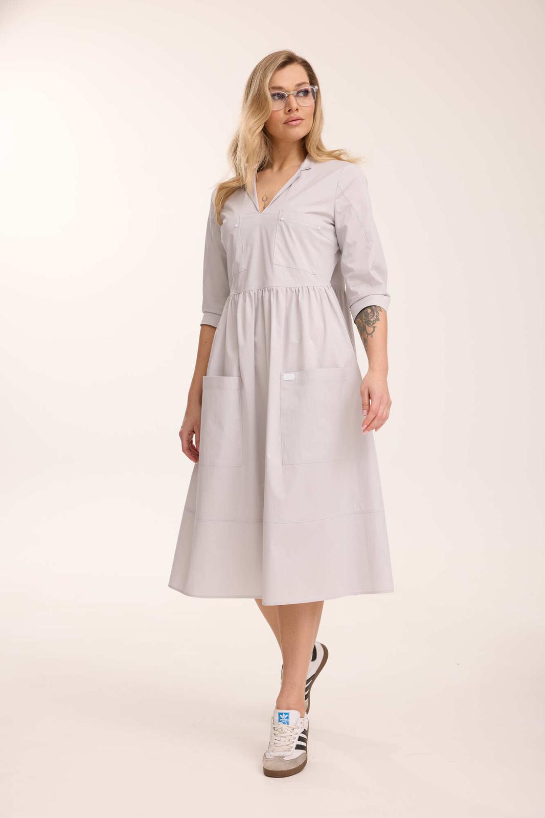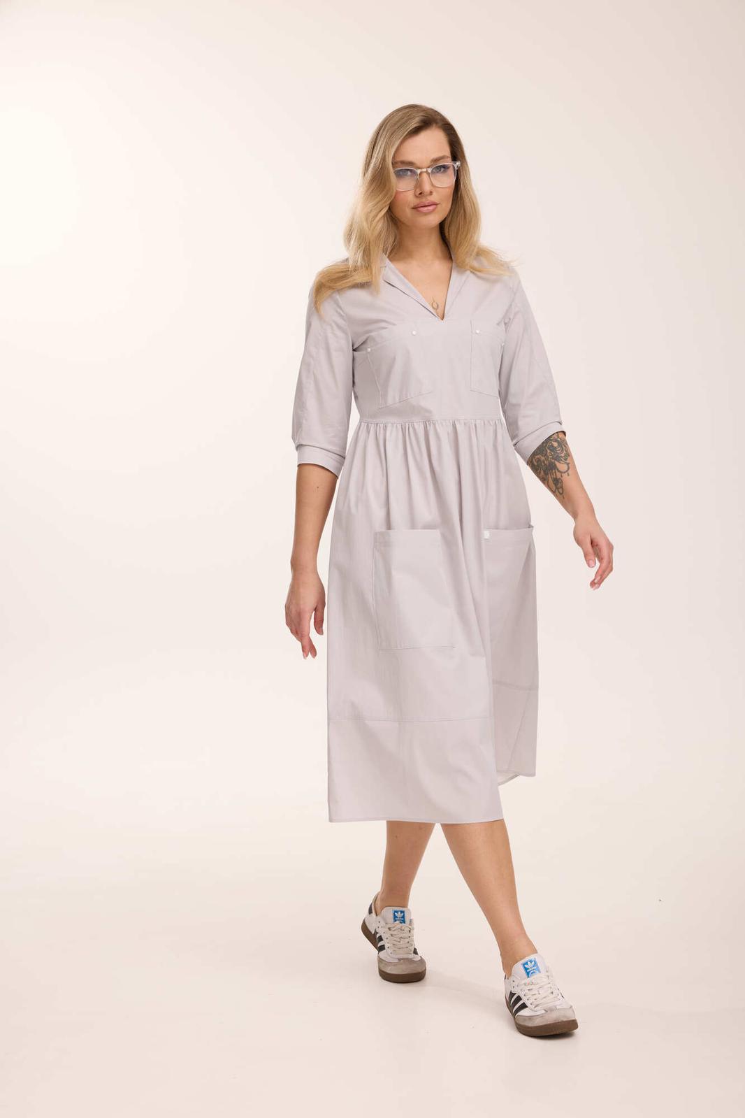 Платье жеское свободного кроя, отрезное по талии. По переду лифа и переду юбки расположены накладные карманы, декорированные хольнитенами и нашивкой. Верх юбки присборен. Горловина V-образной формы, с отложным воротником. Рукав втачной двухшовный, по низу обработан притачной манжетой, застегивающейся на кнопку, длиной 3/4. Декоративные элементы и фурнитура могут отличаться от заявленных на фото. Цвет материала может отличаться по тону в зависимости от настроек вашего монитора!