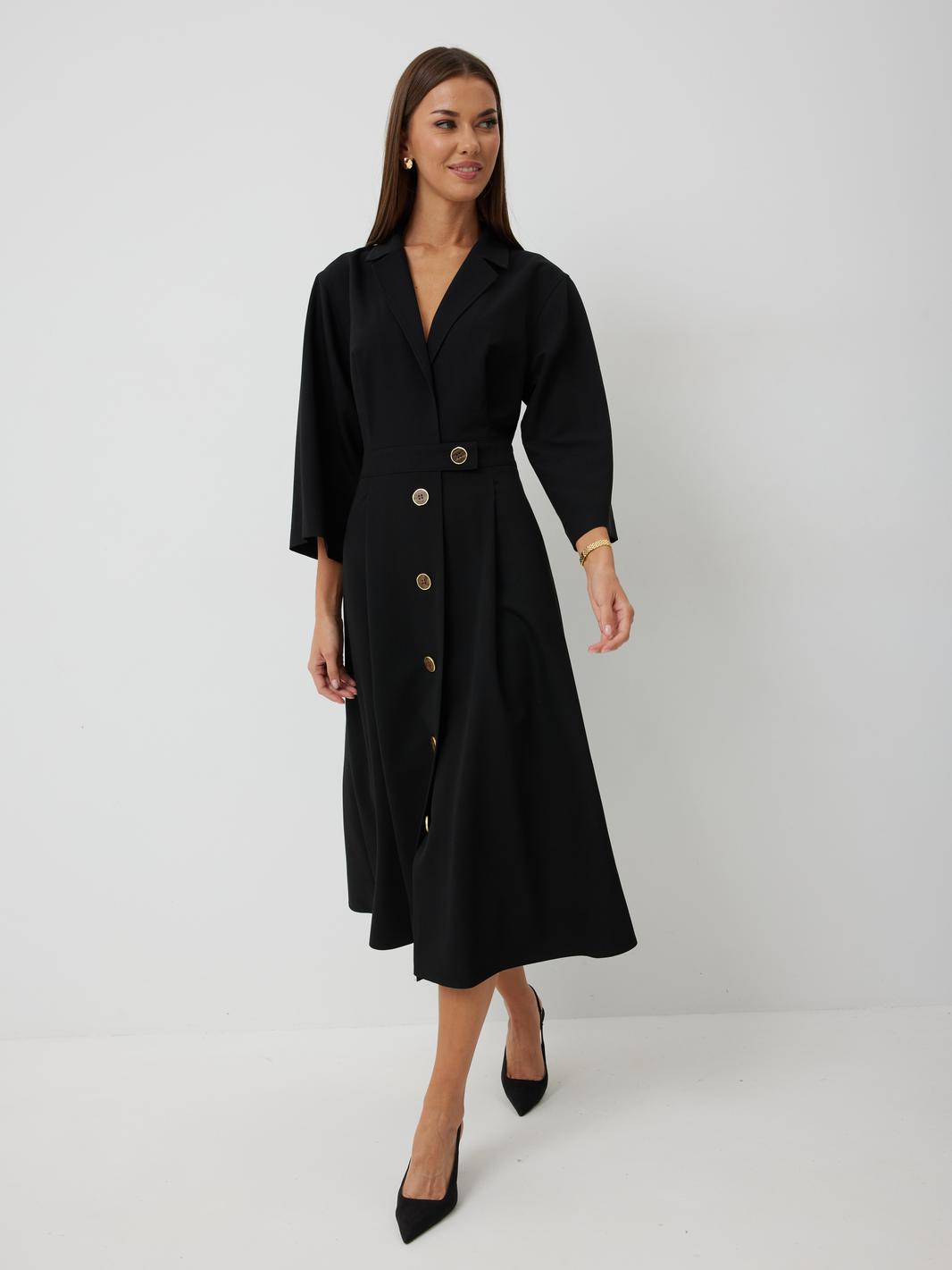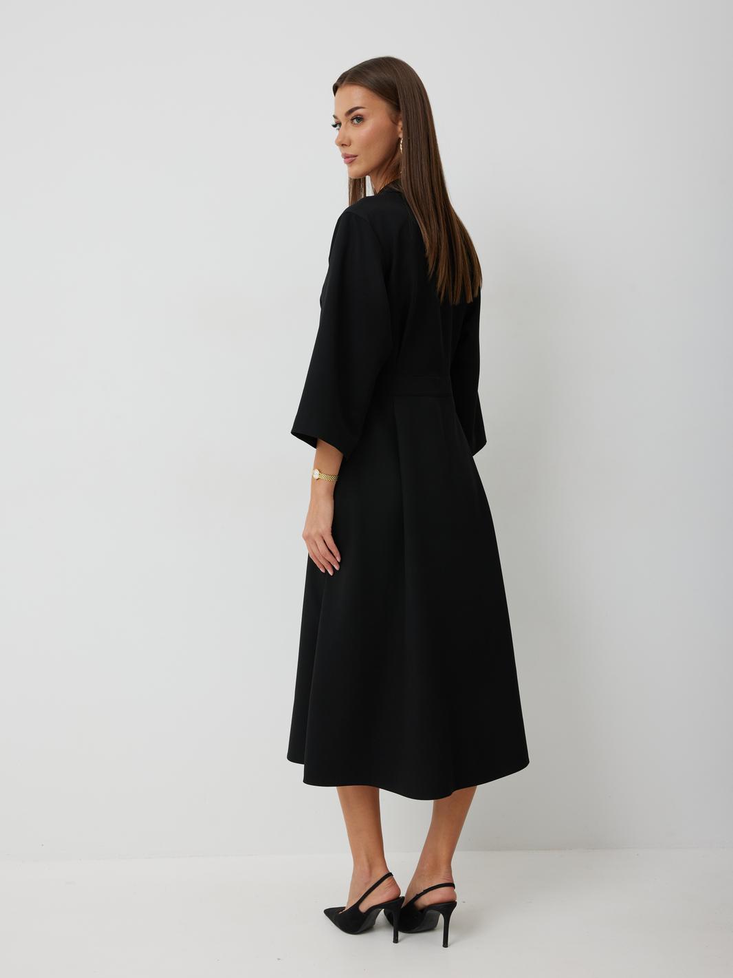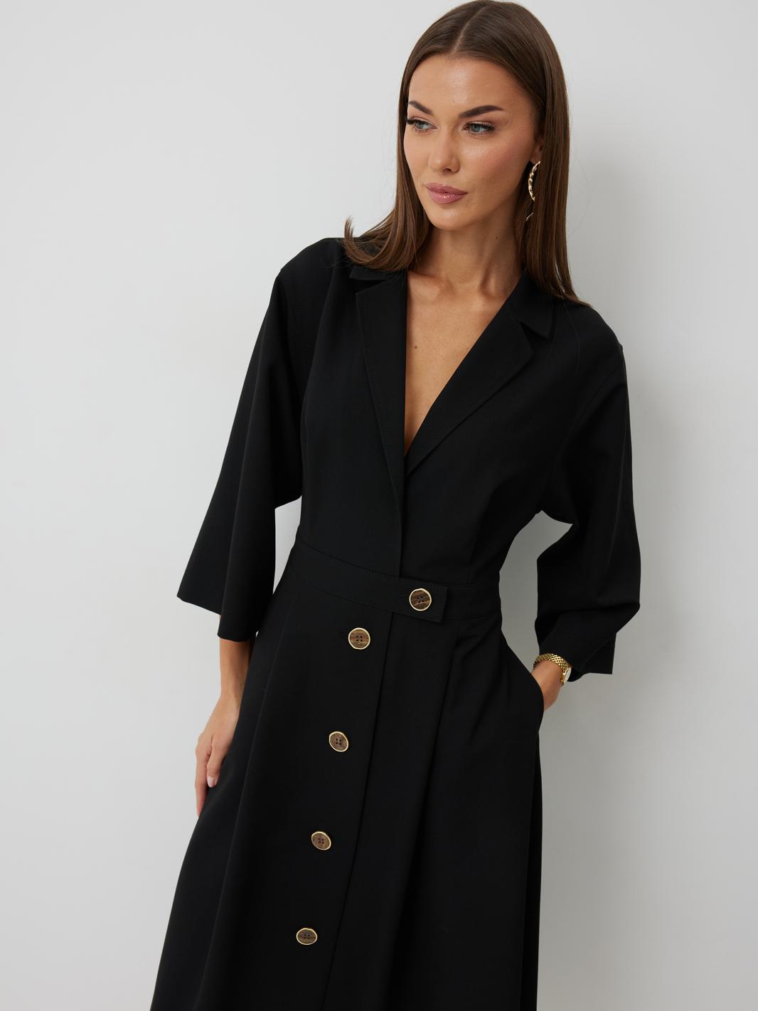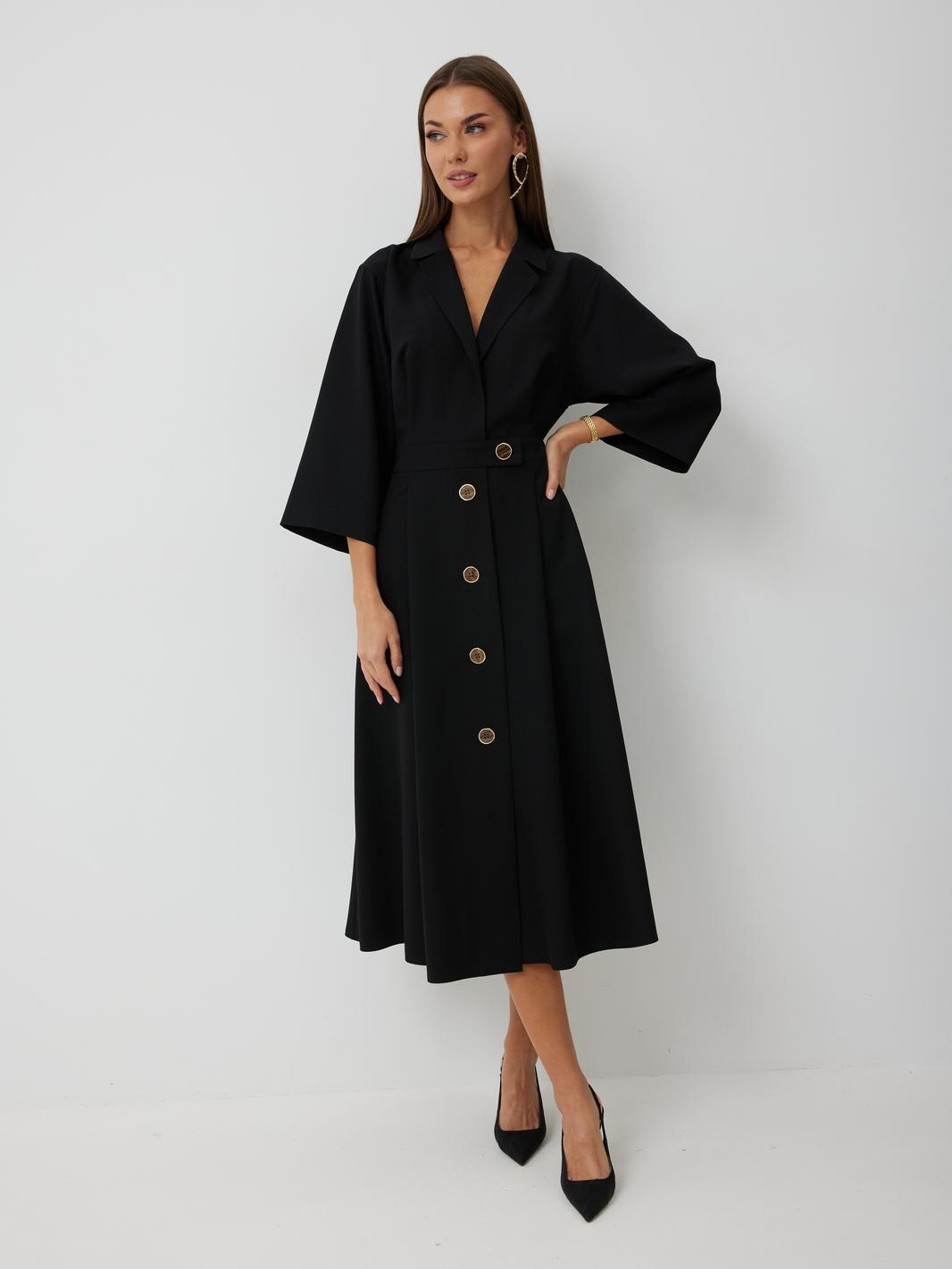 Платье женское полуприлегающего силуэта, отрезное по линии талии с застежкой по центральной части переда на декоративные пуговицы. Платье длиной до середины икры. По отрезному лифу с юбке полочки и спинки заложены складки. Лиф с юбкой соединены втачным поясом, по которому прострочена отделочная строчка. Рукав втачной прямой до середины локтя. По пройме прострочена отделочная строчка. Горловина платья обработана втачным воротником с отложными лацканами.