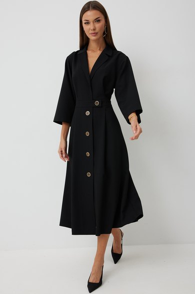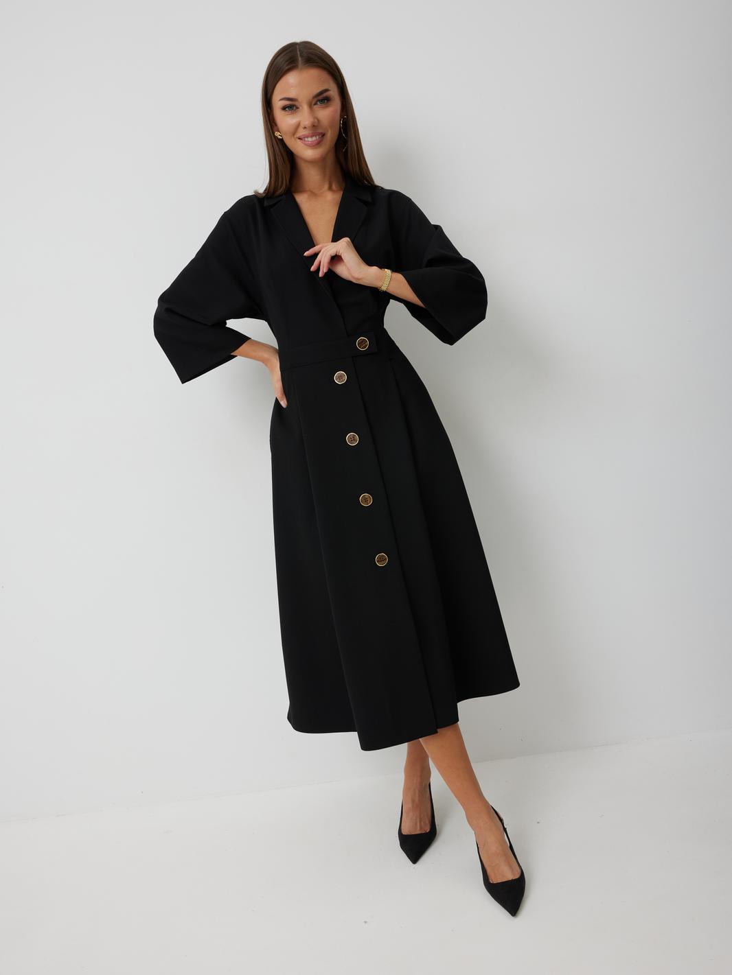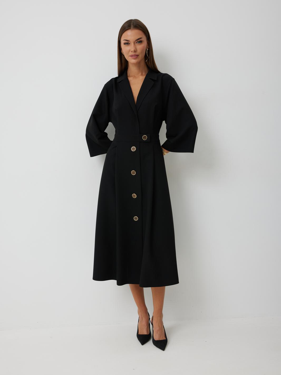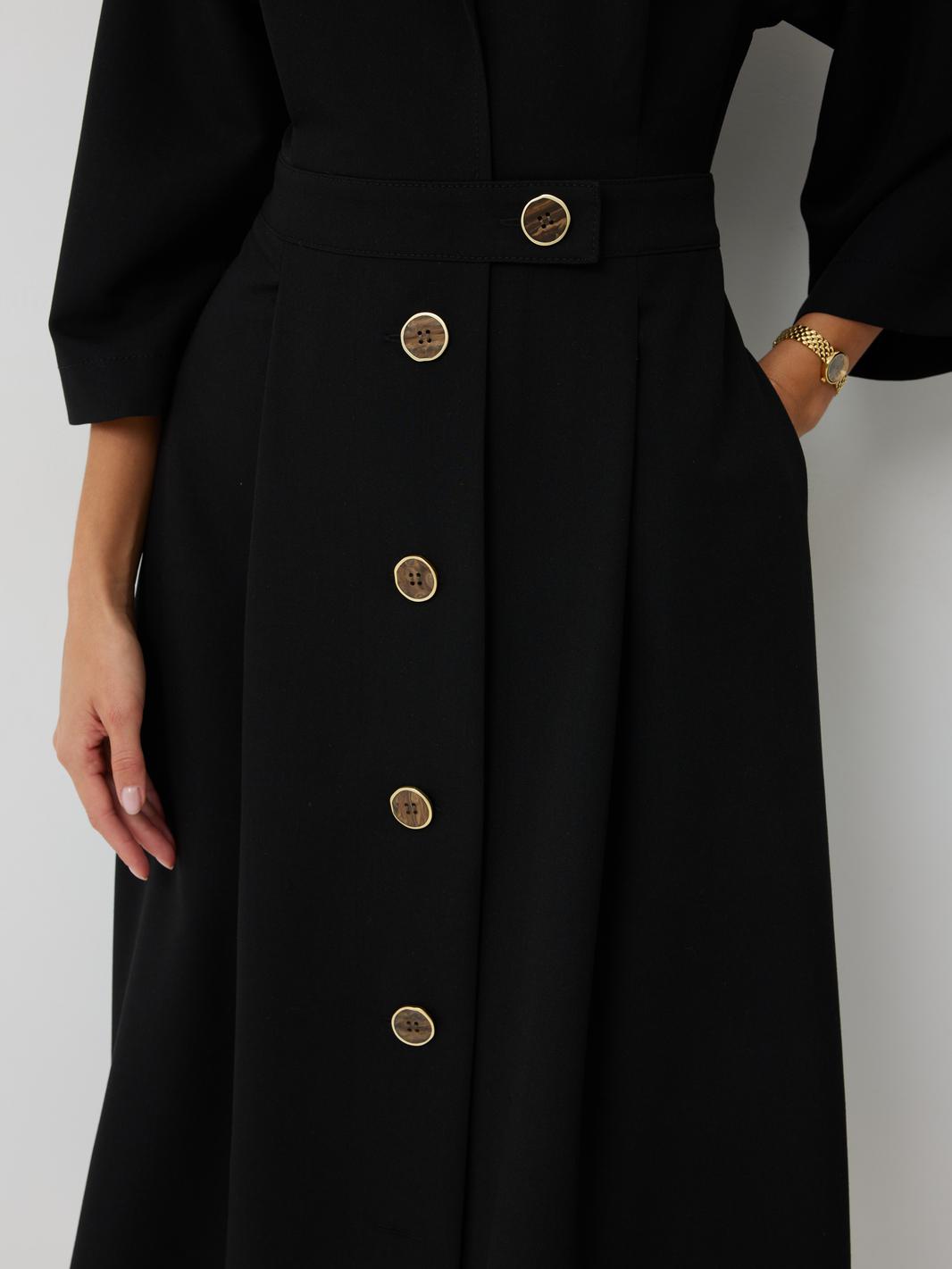 Платье женское полуприлегающего силуэта, отрезное по линии талии с застежкой по центральной части переда на декоративные пуговицы. Платье длиной до середины икры. По отрезному лифу с юбке полочки и спинки заложены складки. Лиф с юбкой соединены втачным поясом, по которому прострочена отделочная строчка. Рукав втачной прямой до середины локтя. По пройме прострочена отделочная строчка. Горловина платья обработана втачным воротником с отложными лацканами.
