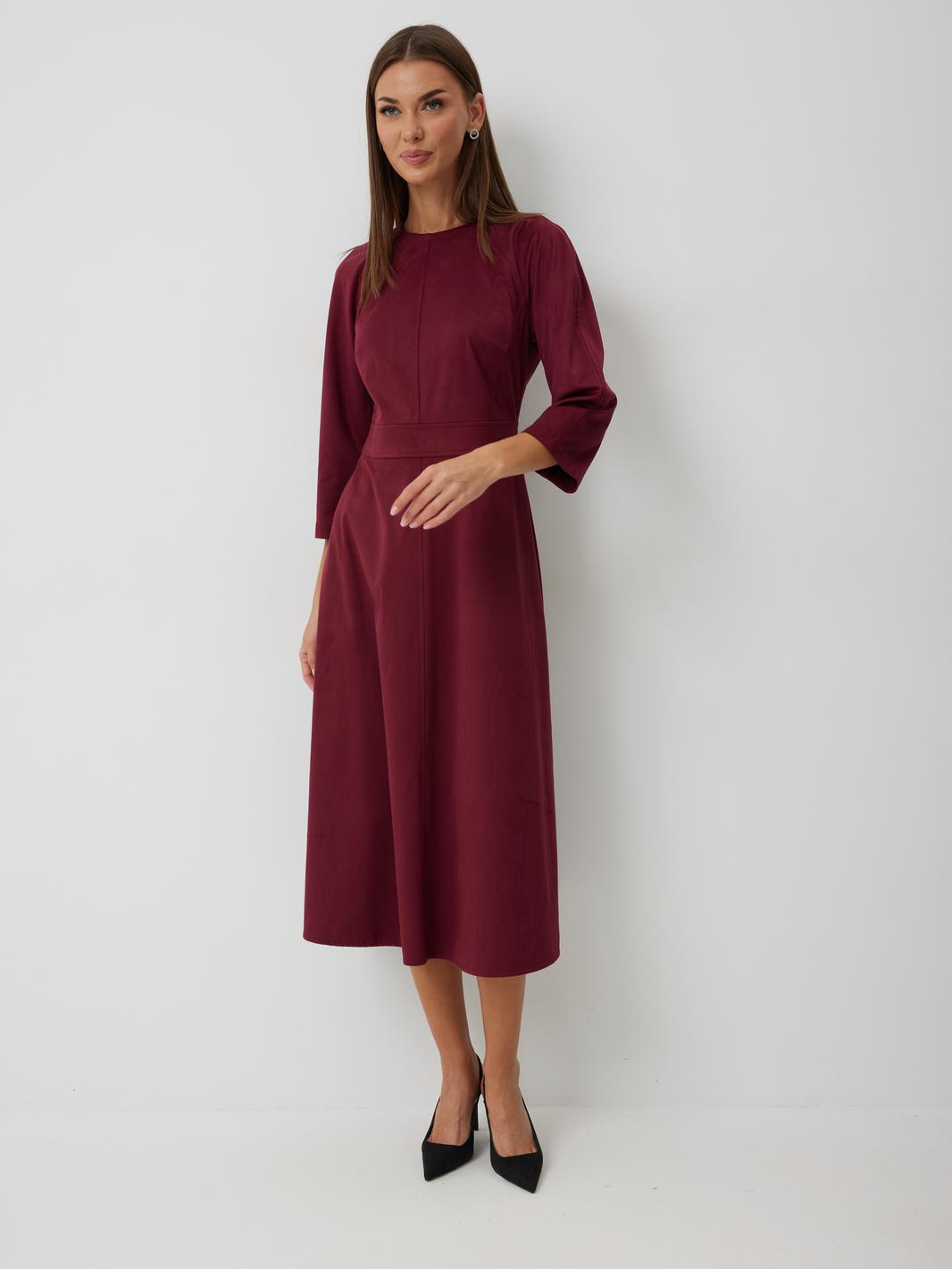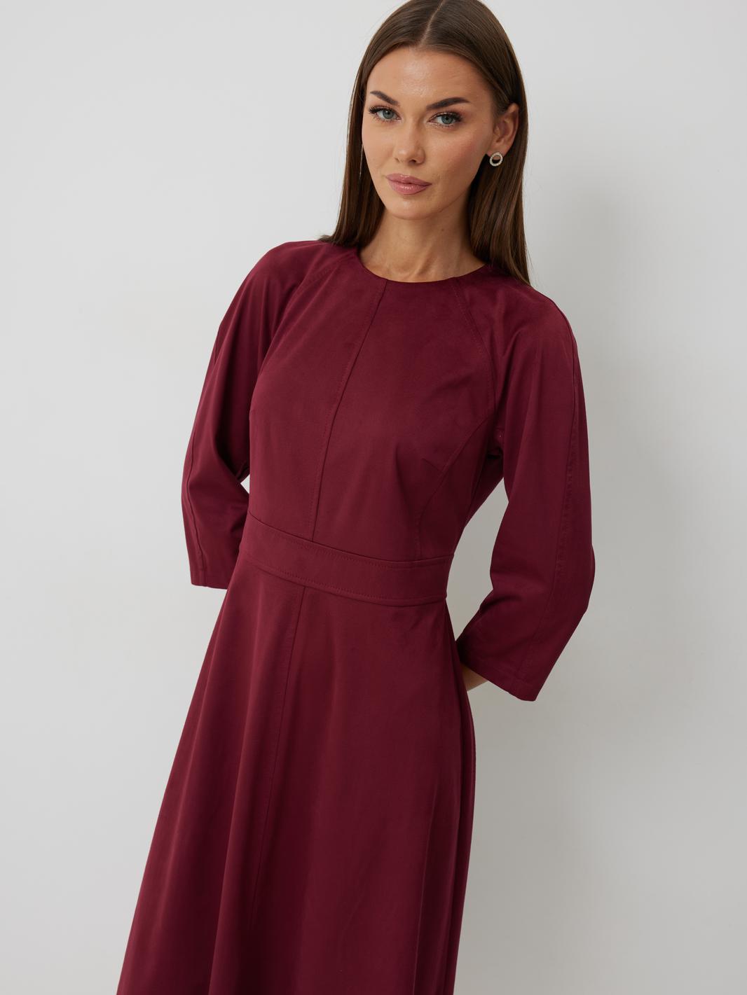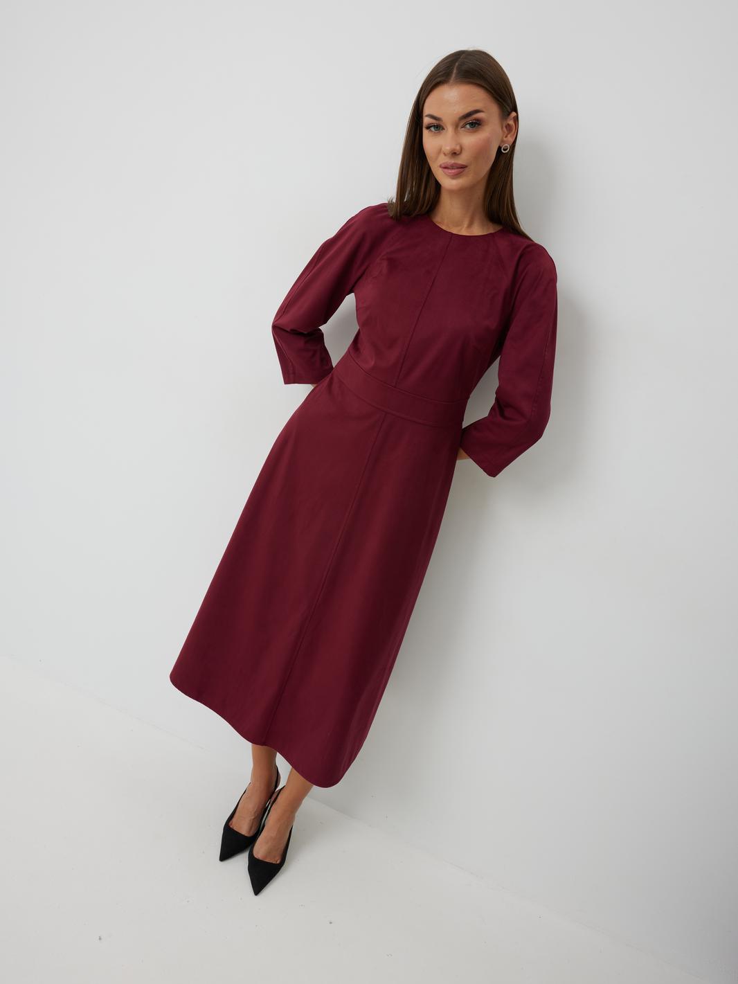 Платье женское полуприлегающего силуэта без подкладки, длиной до середины икры. Платье с отрезным лифом. По переду лиф с центральным швом, отрезными бочками и нагрудными вытачками. Спинка лифа с центральным швом и отрезными бочками. Отрезная юбка по переду и спинке со средним швом. Юбка соединяется с лифом отрезным поясом. Рукав-реглан полной длинны. Низ рукава и платья обработан швом «в подгибку». Горловина платья обработана обтачкой. По среднему шву спинки располагается застежка-молния.