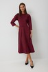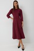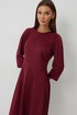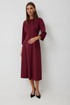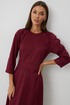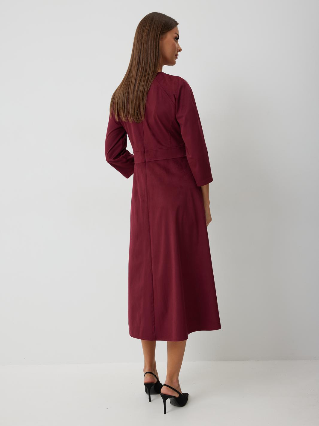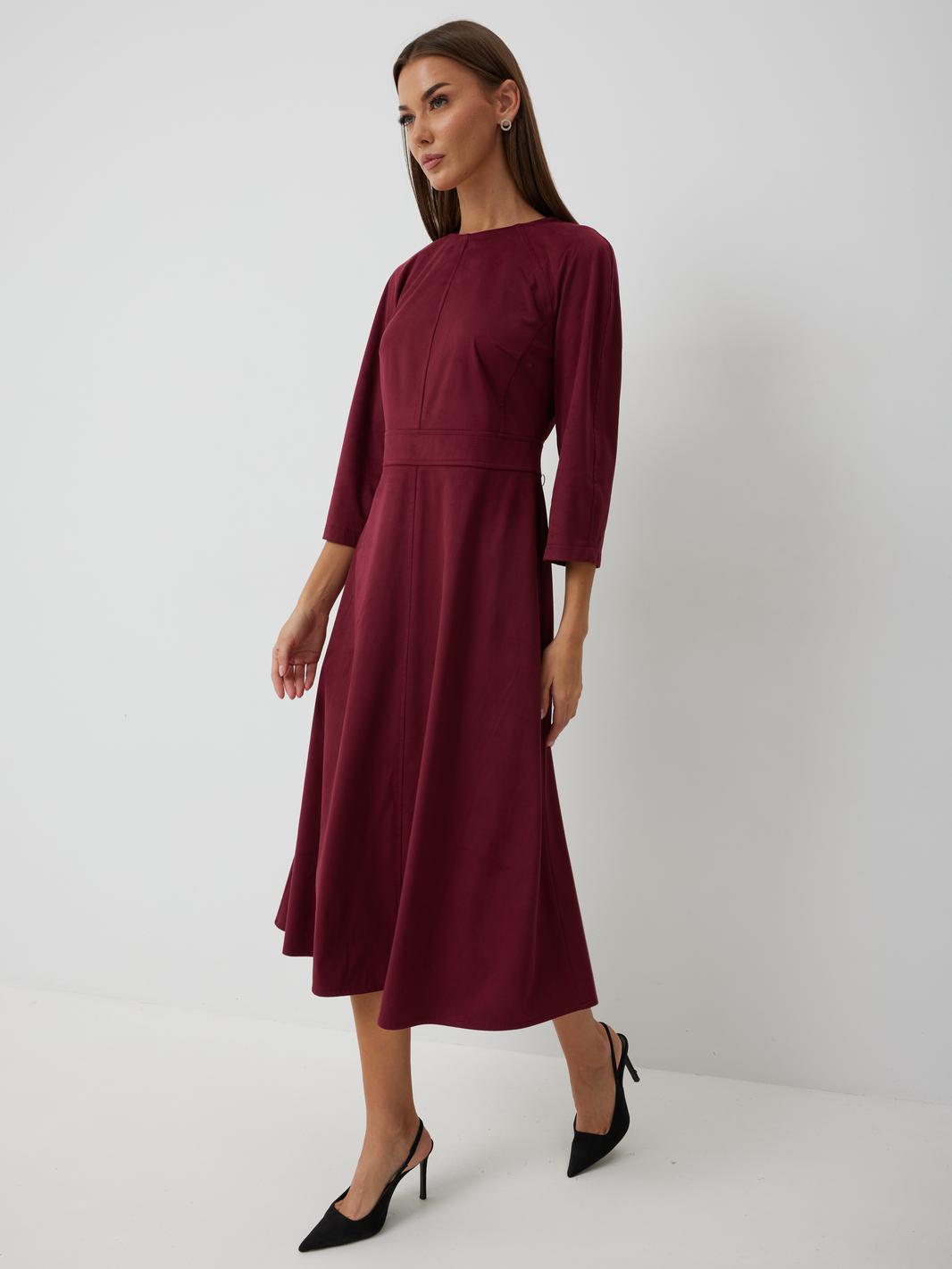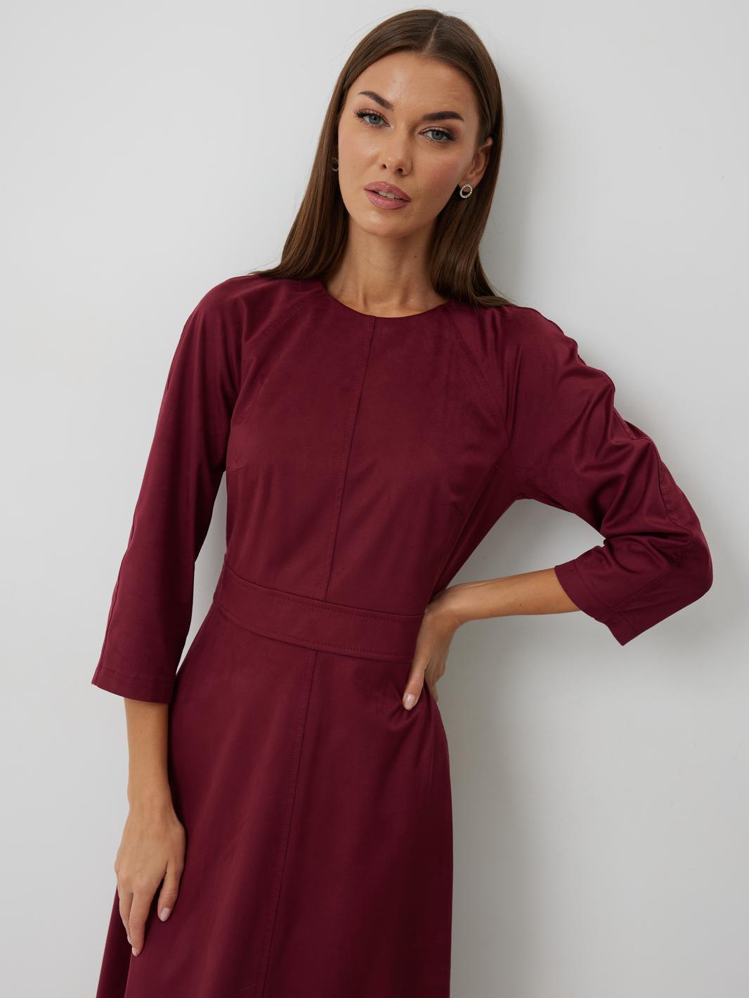 Платье женское полуприлегающего силуэта без подкладки, длиной до середины икры. Платье с отрезным лифом. По переду лиф с центральным швом, отрезными бочками и нагрудными вытачками. Спинка лифа с центральным швом и отрезными бочками. Отрезная юбка по переду и спинке со средним швом. Юбка соединяется с лифом отрезным поясом. Рукав-реглан полной длинны. Низ рукава и платья обработан швом «в подгибку». Горловина платья обработана обтачкой. По среднему шву спинки располагается застежка-молния.