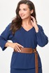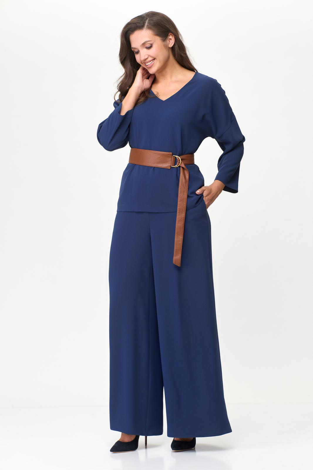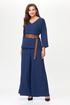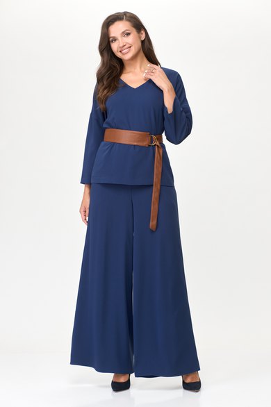 Комплект женский , состоящий из топа и брюк. Топ с V-образным вырезом горловины и спущенной линией плеча. Брюки типа палаццо на резинке с карманами в боковых швах. В комплект входит пояс из эко кожи . Длина рукава от горловины 60см , длина топа 59см , длина брюк 105 см