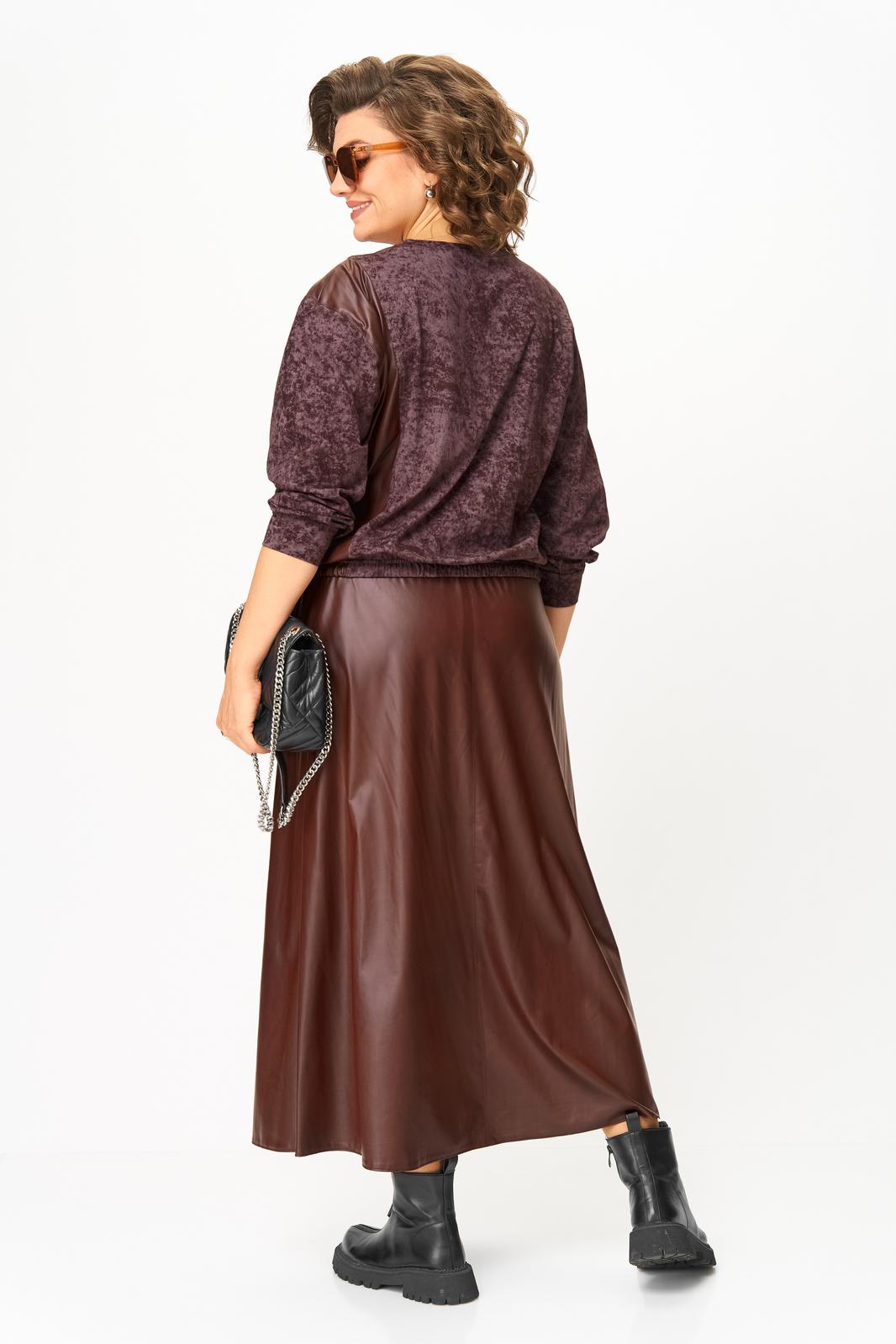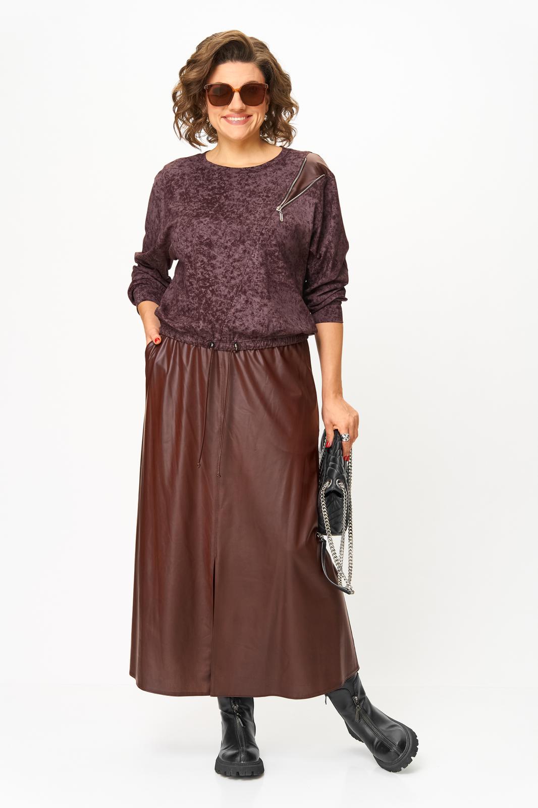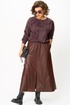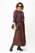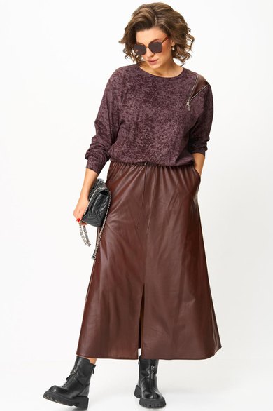 Юбка выполнена из трикотажного полотна с эффектом кожи. Длина макси. Силуэт свободный , трапециевидный. Пояс юбки на резинке. Карманы в боковых швах. По центру юбки средний шов с отделкой. Заднее половина юбки аналогична передней.