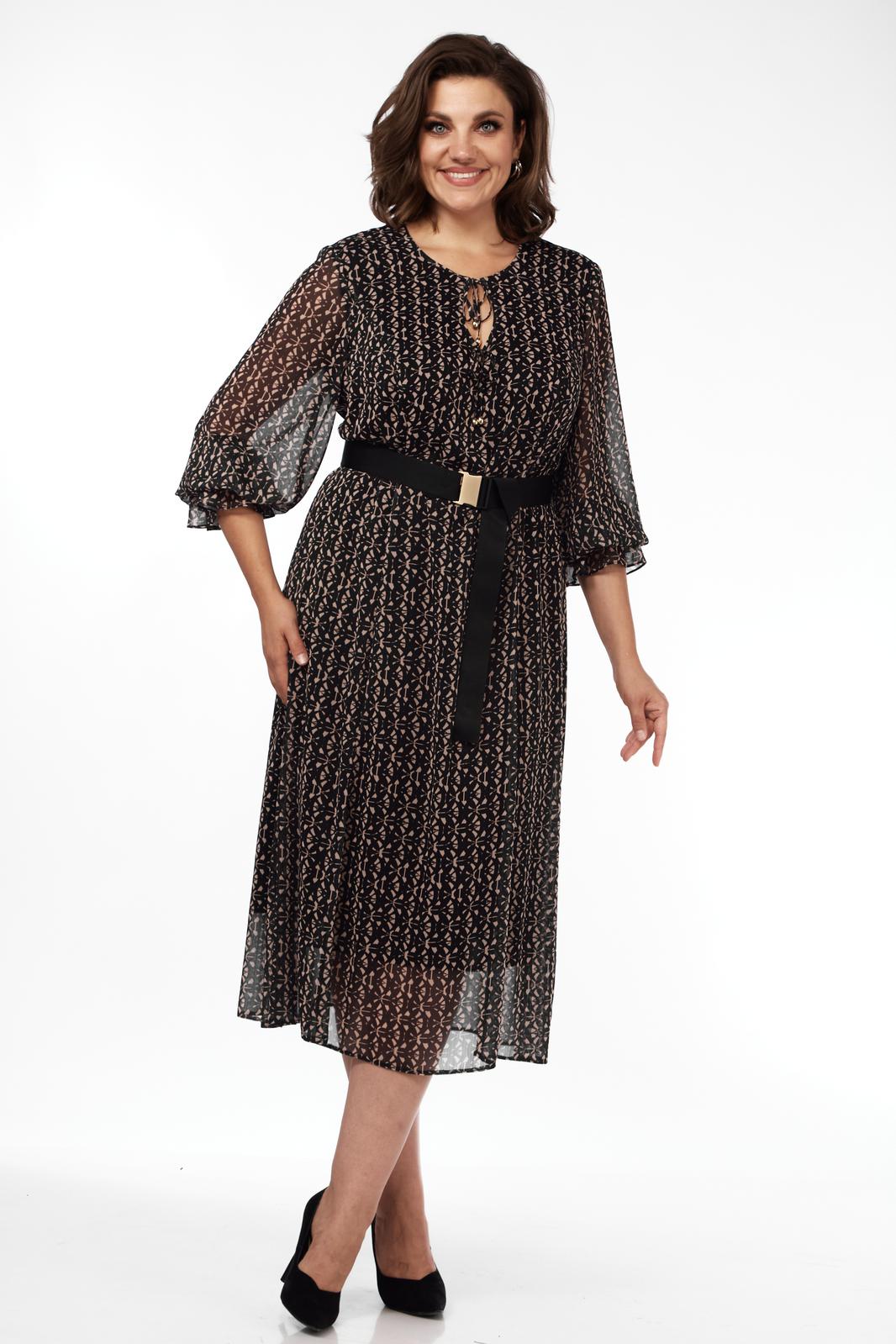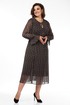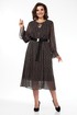 Силуэт платья полуприлегающий, к низу небольшое расклешение. По переду вертикальные рельефы выходящие из проймы. Декольте оформлено в виде фигурного выреза с декоративными завязками. Спинка со средним швом и рельефами выходящие из проймы. Платье без застёжки. Пояс съёмный, состоит из ременной тесьмы и металлической пряжки карабин. Пояс в комплекте.