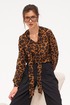 Блузка с длинным рукавом на манжете, V-образным вырезом по горловине и бантом-завязкой с металлофурнитурой.