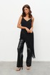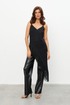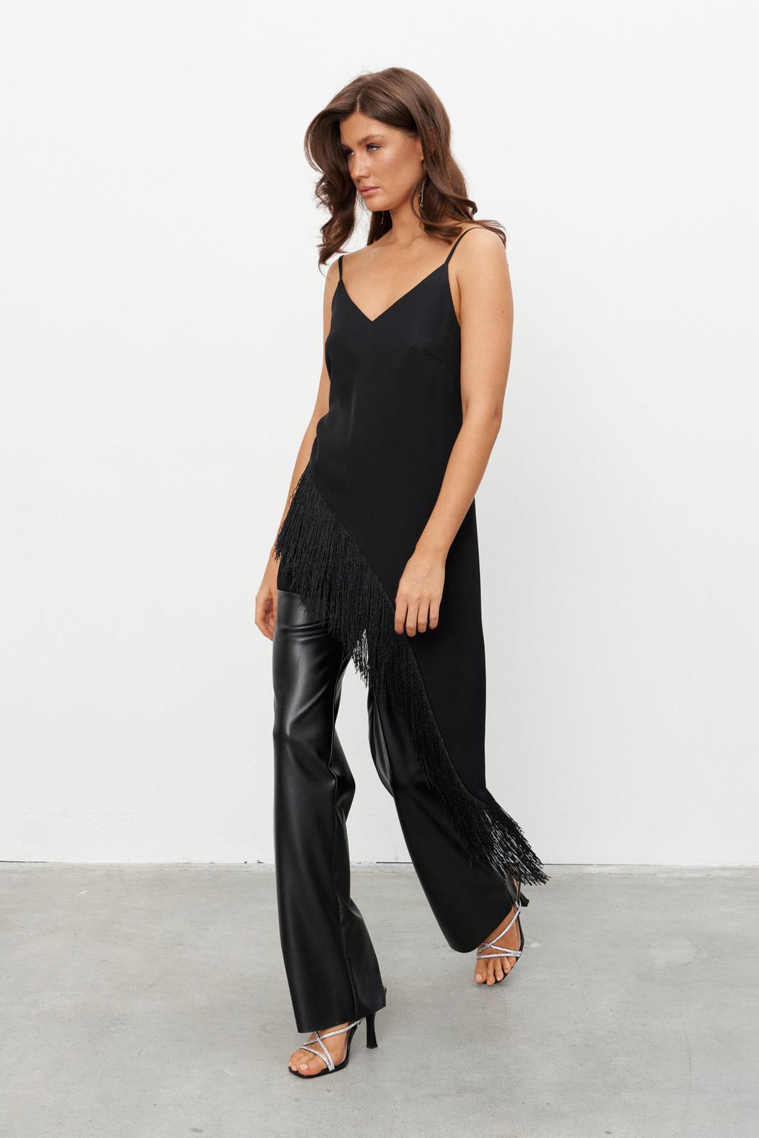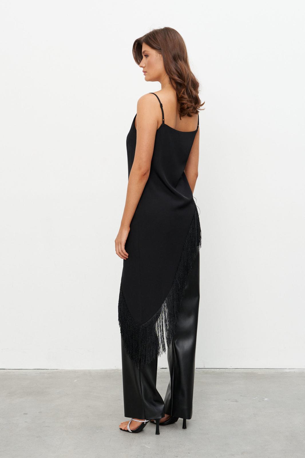 Топ на бретелях с асимметричным низом, обрамлённым бахромой, выполнен из струящейся ткани. Длина бретелей регулируется.