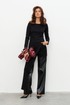 Брюки прямого силуэта выполнены на сочетании плотного джинса и экокожи. Брюки на поясе со шлёвками и застежкой на металлические пуговицы-болты. По переду два прорезных кармана, по спинке - два накладных.
