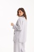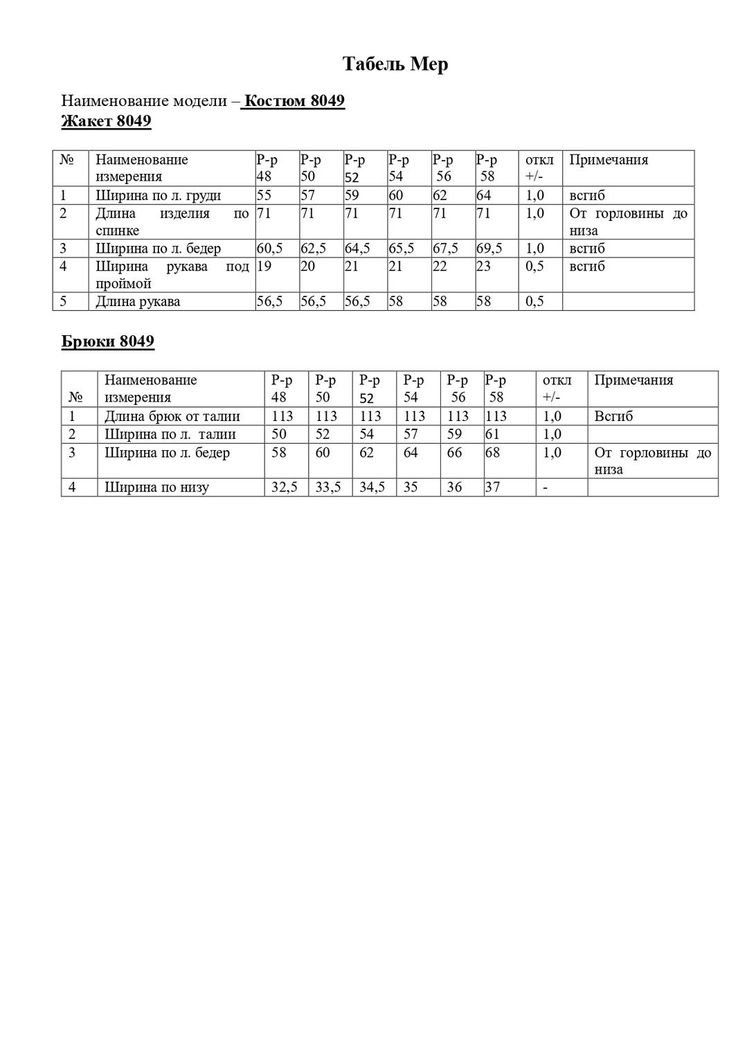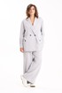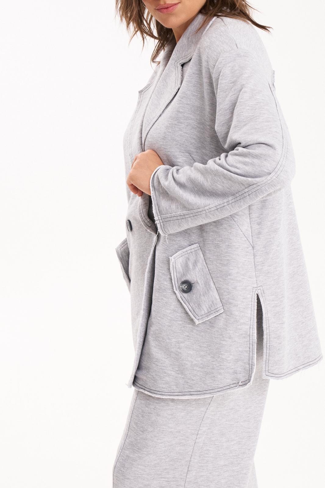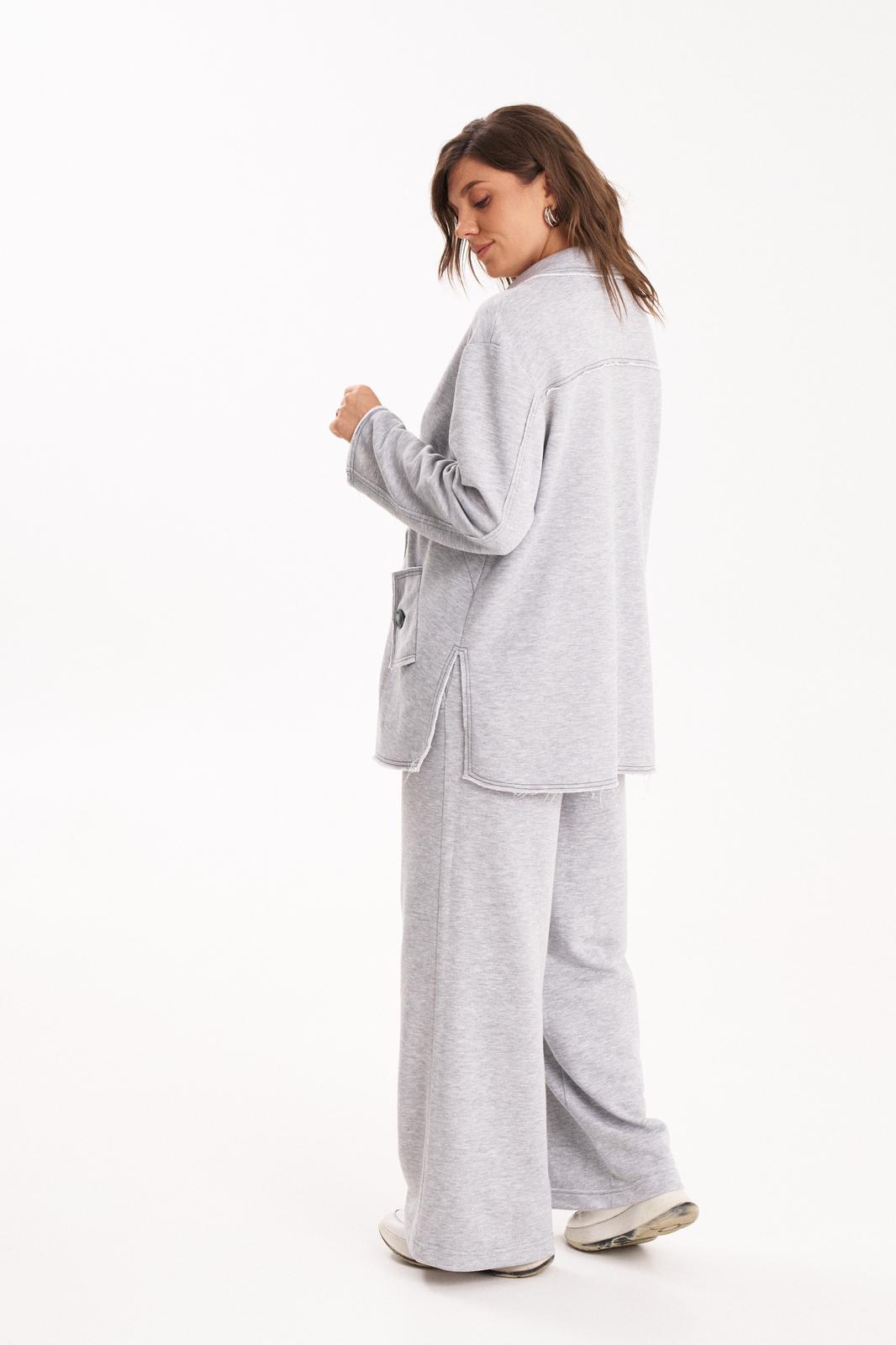 Костюм состоящий из жакета и брюк. Жакет прямого силуэта со спущенной линией плеча и двубортной застёжкой. Все края жакета с сырыми срезами, которые отстрочены контрастной ниткой. Спереди два кармана с клапанами. Брюки прямые от бедра на резинке по талии с карманами по бокам.