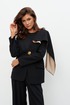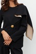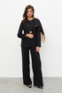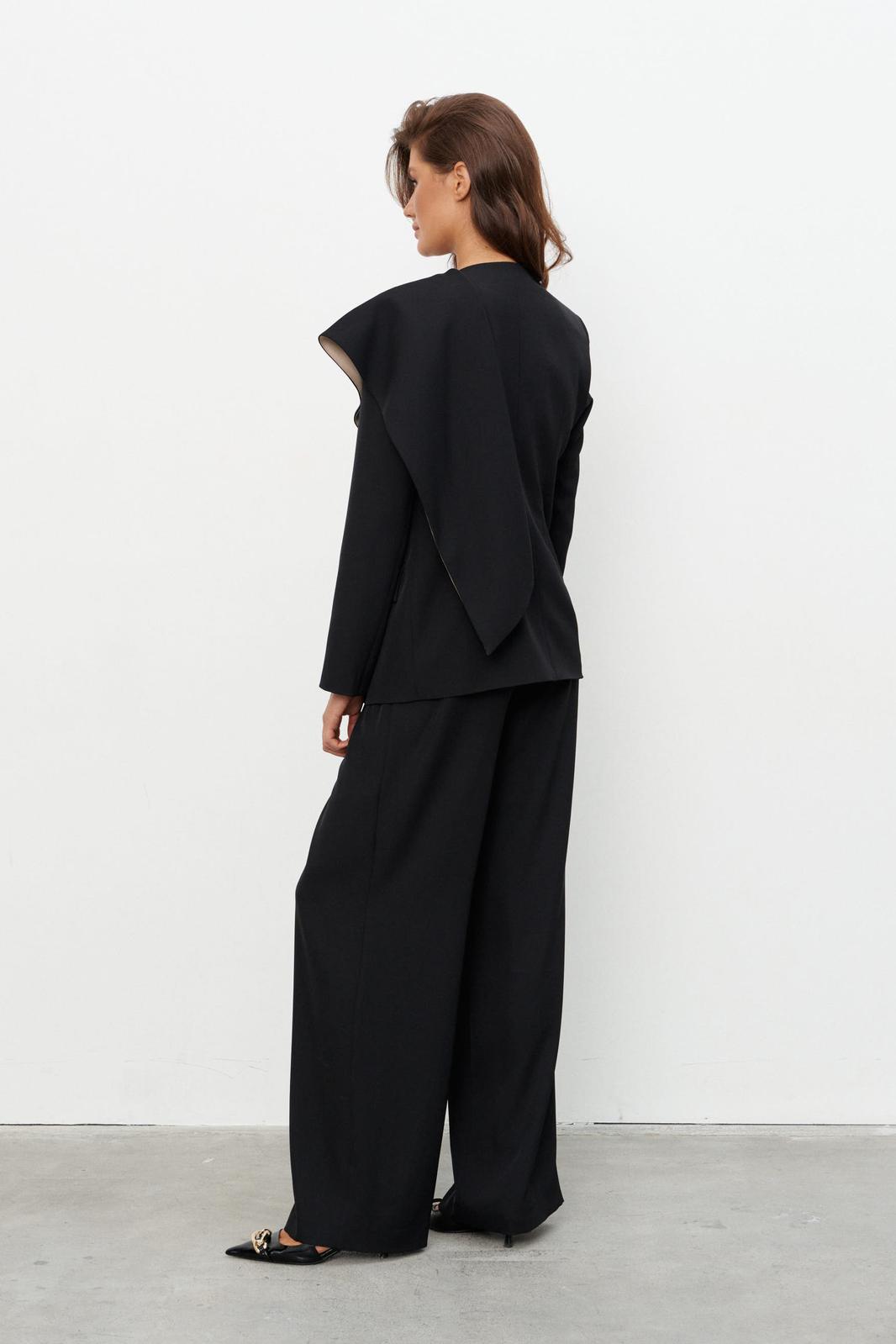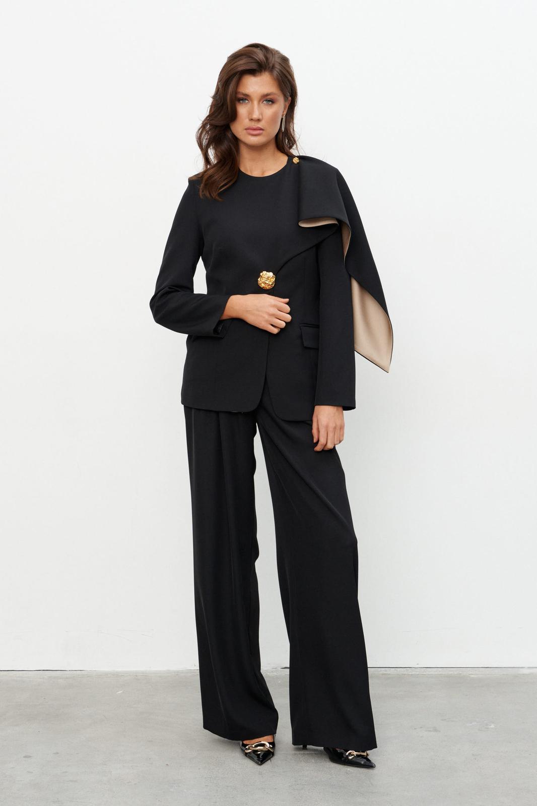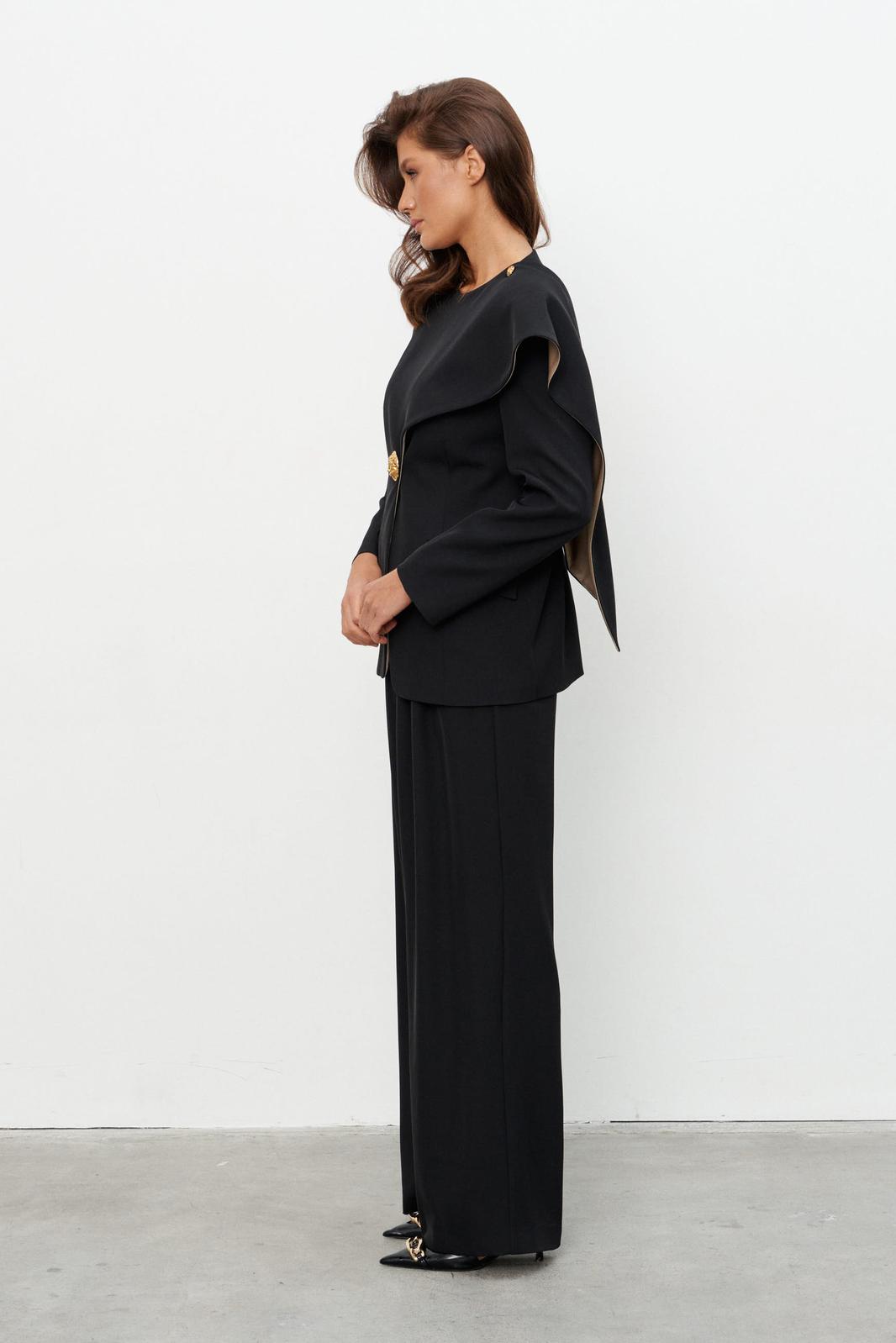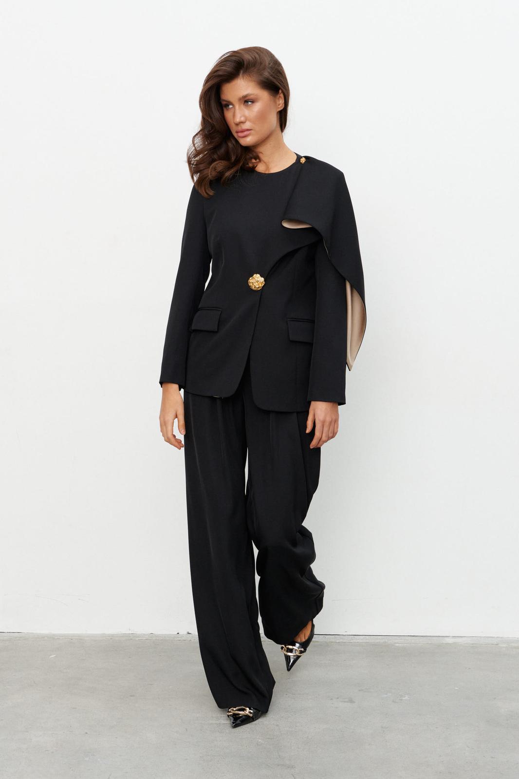 Комплект состоящий из жакета и брюк выполненных из струящейся ткани. Жакет асимметричного кроя с правым бортом переходящим в шаль, которая перекидывается на спину и фиксируется золотой пуговицей возле горловины. Жакет с плечевыми накладками, по переду два прорезных кармана с клапанами. Застёжка на массивную золотую кнопку. Изделие частично на золотистой подкладке в декоративных целях.