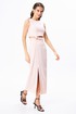 Комплект, состоящий из двух изделий, которые соединяются вручную с помощью завязок. Лиф приталенный с потайной молнией в боковом шве. Юбка длины миди слегка разведена книзу трапецией. В рельефе по переду разрез. В боковом шве потайная молния.